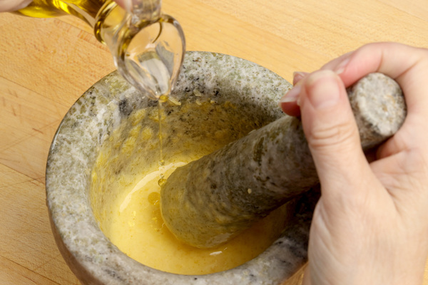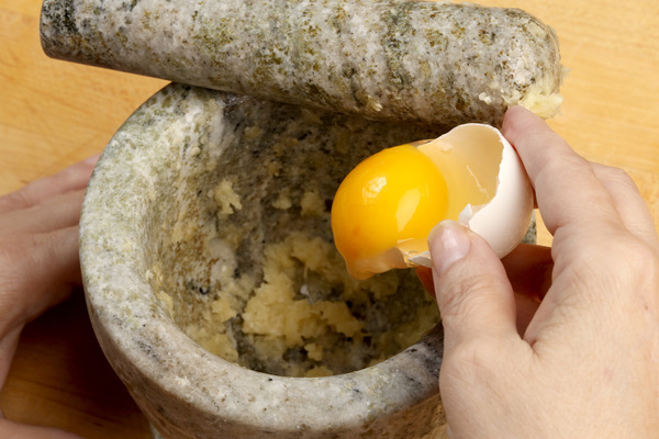 2. When the garlic's as crushed as the dreams of my youth, you have several options. You can go totally old school and just add the oil (see 2a below). Or, you can smush a raw egg yolk into the garlic with the pestle. Or, you can take the advice of my colleague chef Elaine Sikorski (never a bad idea) and add about an ounce of cooked potato. Either yolk or potato help hold the sauce together.