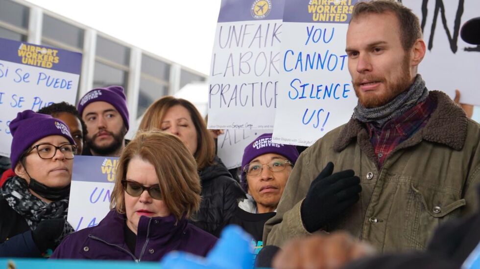 The public demonstration near Terminals 1 and 2 included Chris Enterline, a cargo transport agent, who said supervisors have harangued him for union activity. “They pulled me aside and told me this is going to be a career ender for me. I’ve had co-workers tell me to watch my back,” said Enterline, a Northwest Side resident in his first year on the job.