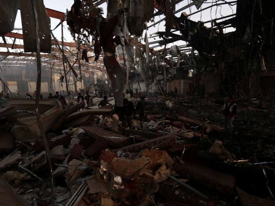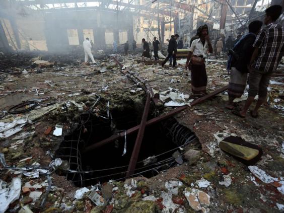 An air strike has killed at least 82 people and wounded more than 500 after it hit a funeral hall packed with mourners in Sanaa, Yemen's capital.