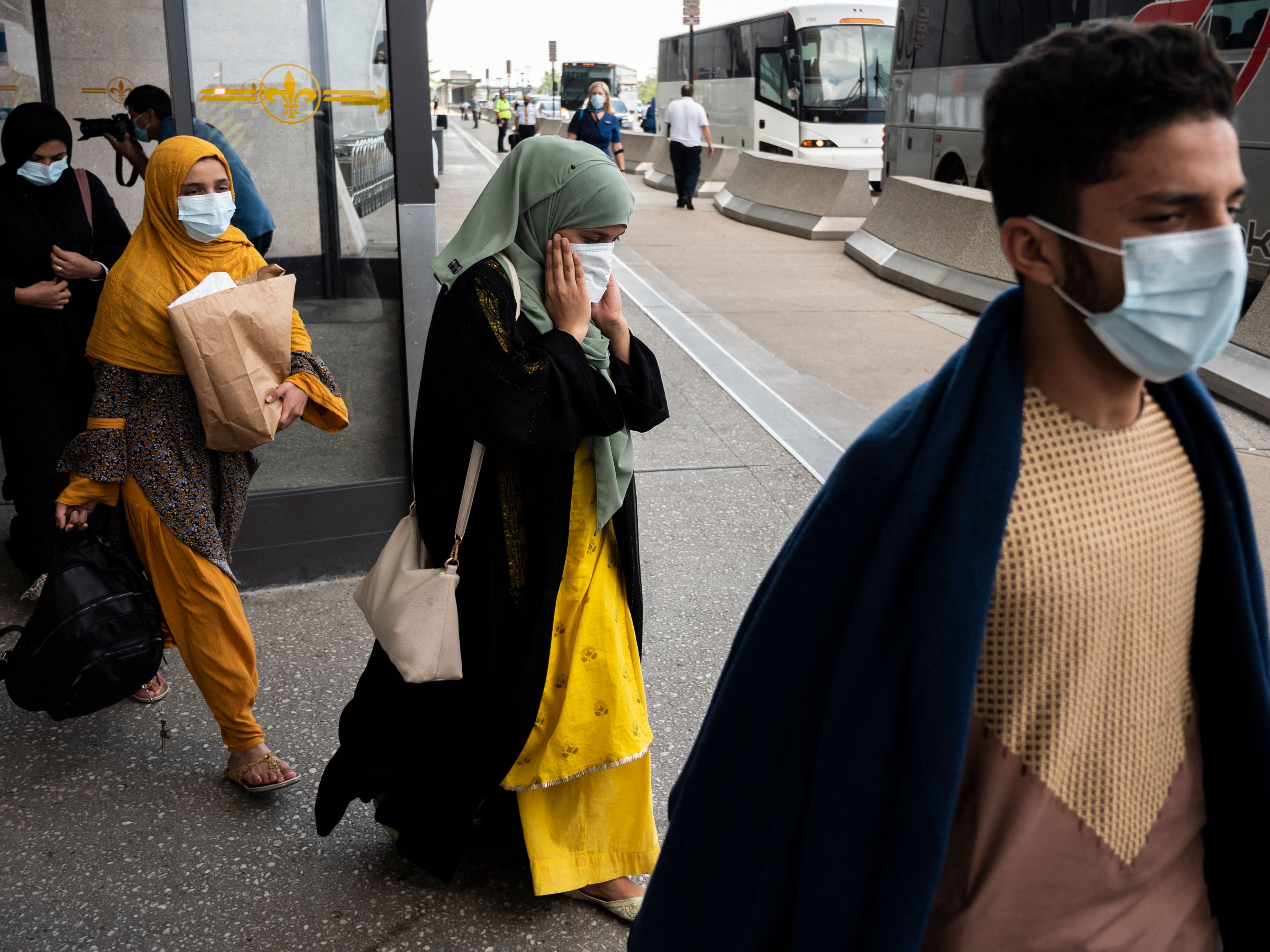 Refugees from Afghanistan board a bus after arriving and being processed at Dulles International Airport in Dulles, Virginia on August 23, 2021.
