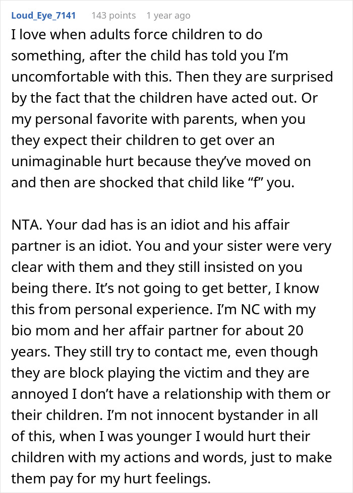 In one example, a teenager shared the emotional toll of attending her father’s engagement party with the woman he had an affair with during her mother’s terminal illness. Although she and her sister refused to go, their father insisted on making the event their mandatory visitation time. At the party, emotions boiled over, and the sisters openly expressed their hurt, revealing the family’s unresolved issues. Keep reading for the full story and to see how complex family dynamics unfolded in this difficult situation.