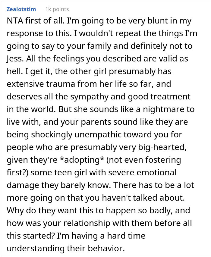This daughter felt that her parents started to neglect her when planning to adopt another teenage girl