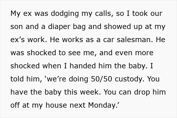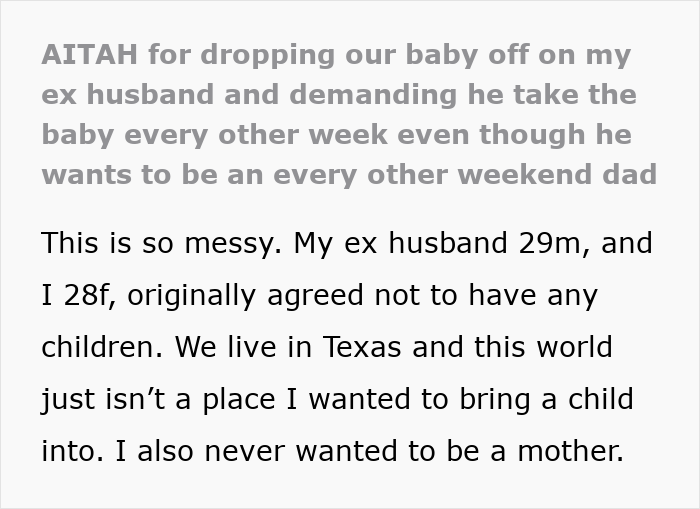 This couple is no different. The woman has been vocal about her reluctance to be a mother, while her ex-husband also refuses to be involved full-time. She one day showed up at his workplace to drop off her son and demand 50/50 custody, further complicating their problem.