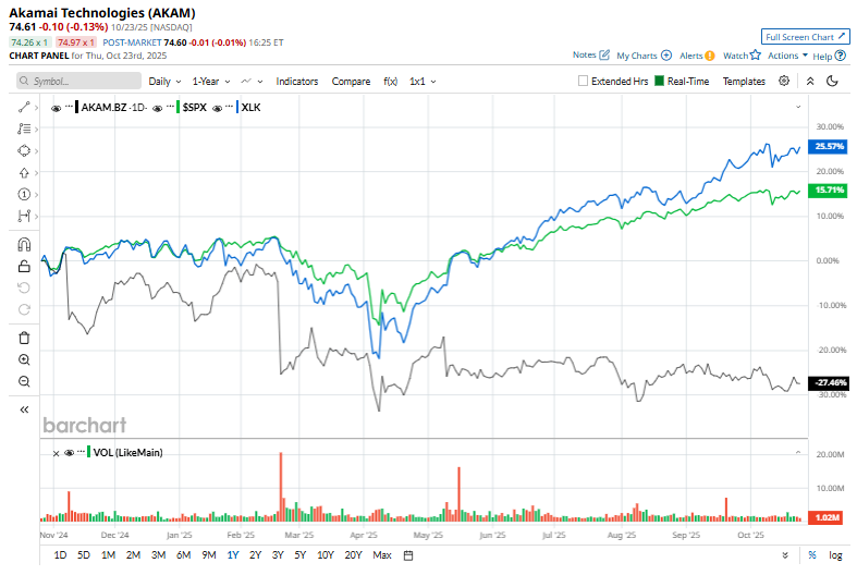 Shares of Akamai Technologies have declined 16% over the past 52 weeks, underperforming the broader S&P 500 Index's ($SPX) 14.5% rise and the Technology Select Sector SPDR Fund's (XLK) 7.6% gain over the same period.