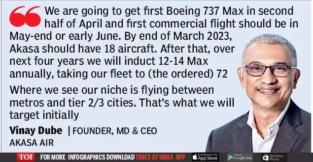 “We are going to get our first Boeing 737 Max in the second half of April and our first commercial flight should be in May-end or early June. By the end of March 2023, Akasa should have 18 aircraft. Post that over the next four years we will induct 12-14 Max annually, taking our fleet to (the ordered) 72,” Dube, an aviation veteran who has held top positions with Jet Airways, GoAir and many big foreign airlines. Recruitment of personnel like pilots, cabin crew and airport staffers has begun.