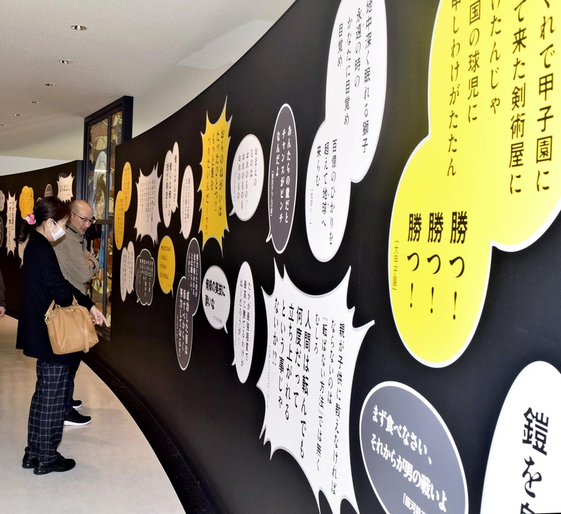 The prints of 30 original manga drawings from the museum's collection are on display at JR Yokote Station to promote the facility's reopening in May.