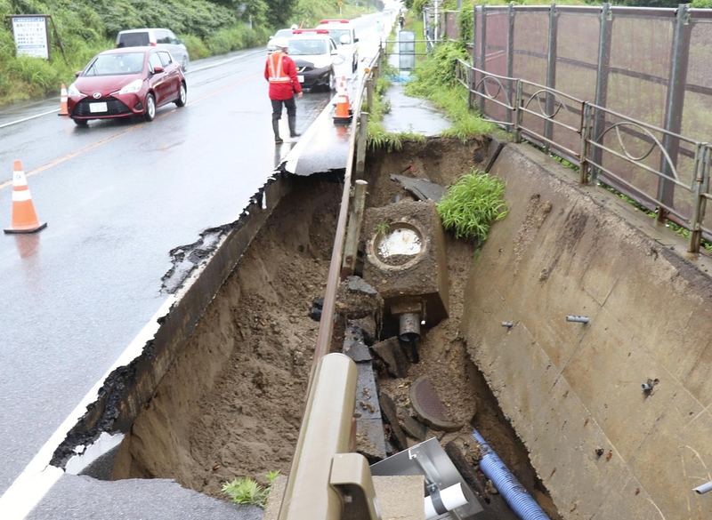According to Akita Prefectural Police, heavy rain is thought to have caused the collapse of an about 10-meter-long and 7-meter-wide stretch of road on National Highway Route 7 in Yurihonjo.
