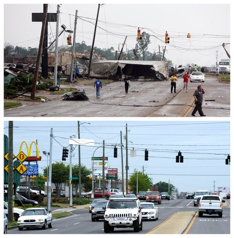 Tornadoes plowed across the Eastern U.S. over four days, killing more than 320 people in six states and causing an estimated $12 billion in damage. Thousands were injured in hardest-hit Alabama, and thousands of homes, businesses, churches and other structures were destroyed. Cleanup costs exceeded $100 million in Tuscaloosa alone.