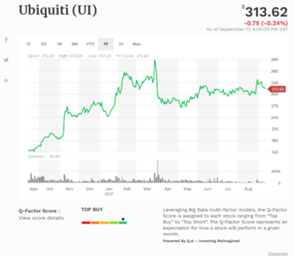Our final Top Buy today is Ubiquiti Inc. Ubiquiti is a tech company that manufactures and sells wireless data communication and wired products for both enterprises and homes. It also operates under several different brand names. Our AI systems rated the company B in Technicals, B in Growth, B in Low Volatility Momentum, and A in Quality Value. The stock closed down 0.24% to $313.62 on volume of 41,161 vs its 10-day price average of $323.43 and its 22-day price average of $314.04, and is up 15.83% for the year. Revenue was $1898.09M in the last fiscal year compared to $1161.73M three years ago, Operating Income was $742.59M in the last fiscal year compared to $412.3M three years ago, EPS was $9.78 in the last fiscal year compared to $4.51 three years ago, and ROE was 155.51% three years ago. The stock is also trading with a Forward 12M P/E of 28.51.