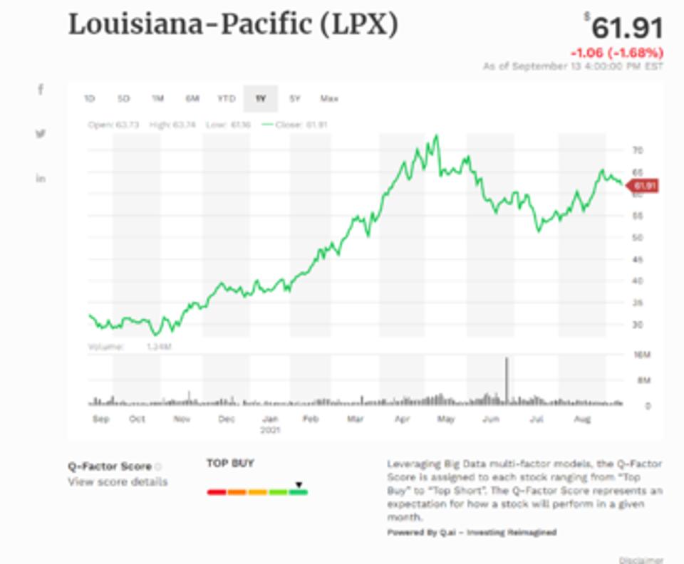 Louisiana-Pacific Corp is today’s fourth Top Short. Louisiana-Pacific is a building materials manufacturer and pioneered the U.S. production of oriented strand board panels. Our AI systems rated Louisiana-Pacific A in Technicals, A in Growth, B in Low Volatility Momentum, and A in Quality Value. The stock closed down 1.68% to $61.91 on volume of 1,342,734 vs its 10-day price average of $63.35 and its 22-day price average of $61.34, and is up 67.64% for the year. Revenue grew by 43.36% in the last fiscal year and grew by 41.34% over the last three fiscal years, Operating Income grew by 143.54% in the last fiscal year and grew by 200.37% over the last three fiscal years, and EPS grew by 160.79% in the last fiscal year and grew by 325.71% over the last three fiscal years. Revenue was $2788.0M in the last fiscal year compared to $2828.0M three years ago, Operating Income was $666.0M in the last fiscal year compared to $540.0M three years ago, EPS was $4.46 in the last fiscal year compared to $2.73 three years ago, and ROE was 44.28% in the last year compared to 24.15% three years ago. The stock is also trading with a Forward 12M P/E of 6.66.