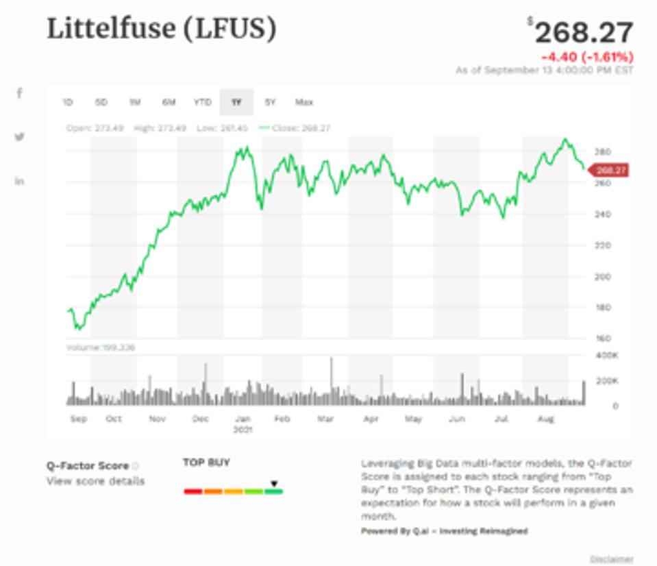 Littelfuse Inc is today’s second Top Buy. Littelfuse Inc operates as a supplier of circuit protection products for the electronics, automotive and electrical industries. Our AI systems rated the company B in Technicals, B in Growth, A in Low Volatility Momentum, and A in Quality Value. The stock closed down 1.61% to $268.27 on volume of 199,336 vs its 10-day price average of $278.44 and its 22-day price average of $277.9, and is up 6.46% for the year. Revenue grew by 23.09% in the last fiscal year and grew by 3.55% over the last three fiscal years, Operating Income grew by 53.58% in the last fiscal year and grew by 13.75% over the last three fiscal years, and EPS grew by 94.0% in the last fiscal year and grew by 57.41% over the last three fiscal years. Revenue was $1445.7M in the last fiscal year compared to $1718.47M three years ago, Operating Income was $202.96M in the last fiscal year compared to $274.03M three years ago, EPS was $5.29 in the last fiscal year compared to $6.52 three years ago, and ROE was 8.37% in the last year compared to 13.68% three years ago. Forward 12M Revenue is expected to grow by 3.82% over the next 12 months, and the stock is trading with a Forward 12M P/E of 22.4.