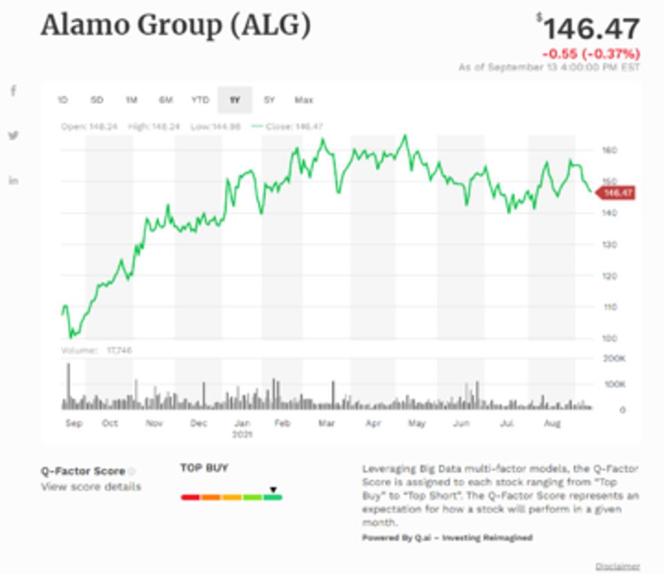 Alamo Group Inc is our first Top Buy today. Alamo Group is a worldwide leader in the design and manufacture of high-quality agricultural equipment for farms and ranches. The company is involved in infrastructure maintenance equipment for governmental and industrial markets as well. Our AI systems rated Alamo Group B in Technicals, C in Growth, B in Low Volatility Momentum, and B in Quality Value. The stock closed down 0.37% to $146.47 on volume of 17,746 vs its 10-day price average of $151.6 and its 22-day price average of $150.79, and is up 6.34% for the year. Revenue grew by 6.5% in the last fiscal year and grew by 22.83% over the last three fiscal years, Operating Income grew by 9.75% in the last fiscal year and grew by 9.29% over the last three fiscal years, and EPS grew by 26.19% in the last fiscal year. Revenue was $1163.47M in the last fiscal year compared to $1008.82M three years ago, Operating Income was $100.66M in the last fiscal year, compared to $101.09M three years ago, EPS was $4.78 in the last fiscal year compared to $6.25 three years ago, and ROE was 9.47% in the last year compared to 15.37% three years ago. Forward 12M Revenue is expected to grow by 4.02% over the next 12 months, and the stock is trading with a Forward 12M P/E of 17.44.