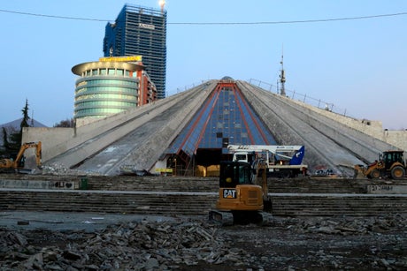 Known to Albanians as the Pyramid, the concrete-and-glass marble-sheathed building looks more like a squashed cone.