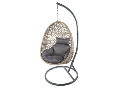 The rattan egg chair comes with a set of grey cushions and hangs from a silver chain on an iron frame.