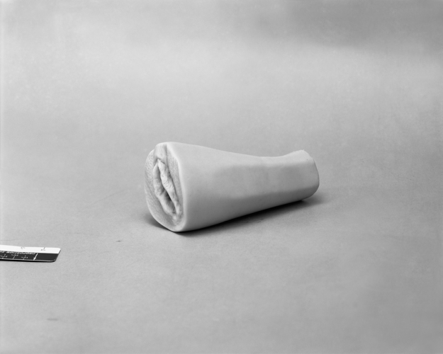 On one wall, a monochrome triptych of objects belonging to a recluse is loaded with suggestion: a homemade knife, two mushrooms (possibly hallucinogenic) and an object that at first glance resembles a fake dog bone, but turns out to be a male sex toy.