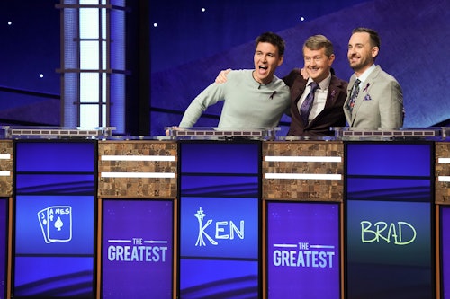 She flipped back to ABC. On TV, Trebek was introducing the three all-star contestants vying for the title of “Greatest of All Time.” The primetime tournament is a matchup of the three biggest winners in Jeopardy! history: Ken Jennings, whose 74-game winning streak in 2004 has never been beat; James Holzauer, who holds the record for highest payday in a single game ($131,127); and Brad Rutter, who’s earned the most money playing Jeopardy! overall — $4 million total. Whoever wins three double-headers first takes home the title. To my amusement, the hashtag #JeopardyGOAT flashed onscreen from time to time.