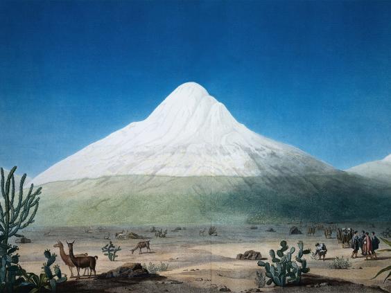 At 18,000ft, they saw a last scrap of lichen clinging to a boulder. After that, all signs of organic life disappeared. Even the condors that had accompanied their previous climbs were absent. As the fog whitewashed the air into an eerie empty space, Humboldt felt completely removed from the inhabited world. "It was," he said, "as if we were trapped inside an air balloon." Then, suddenly, the fog lifted, revealing Chimborazo's snow-capped summit against the blue sky. A "magnificent sight", was Humboldt's first thought, but then he saw the huge crevasse in front of them – 65ft wide. But there was no other way to the top. When Humboldt measured their altitude at 19,413ft, he discovered that they were barely 1,000 feet below the peak.
