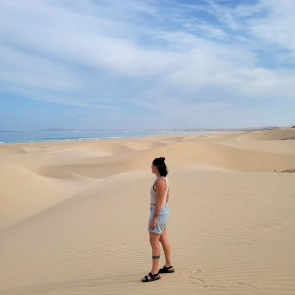 Her ability to strike poses that exude elegance and power against such diverse backdrops showcases her versatility as a model. In the desert, she stands tall and confident, her silhouette cutting a striking figure against the endless expanse of sand and sky. The harsh sunlight only serves to highlight her beauty and poise.
