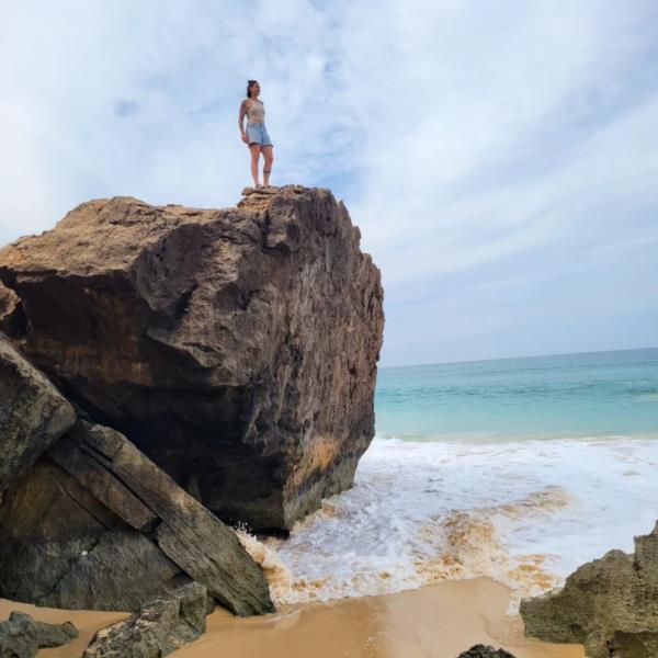On the tranquil beach, Lacrabere appears serene and ethereal, the gentle waves and soft sands providing a serene backdrop to her graceful movements. Her presence against the backdrop of the ocean evokes a sense of calm and tranquility, a stark contrast to the intensity of the desert.