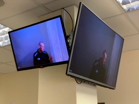 Mr Navalny appeared defiant on a blurry video link from jail during a legal hearing in a separate case, where he could be seen with his head shaven and having lost weight.