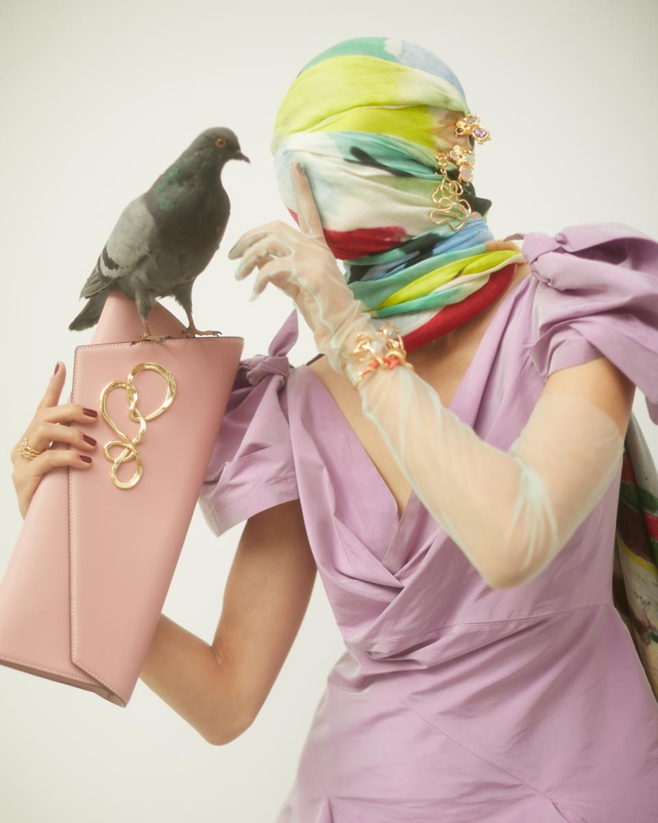 The gold twisted scroll has also been a design aesthetic that I’ve used. I particularly love the juxtaposition of the softness of the scroll with the shape of the angular clutch. It resonated a sense of 80s/90s/futurism that turned me on. Something you can see on Grace Jones and Debbie Harry.”