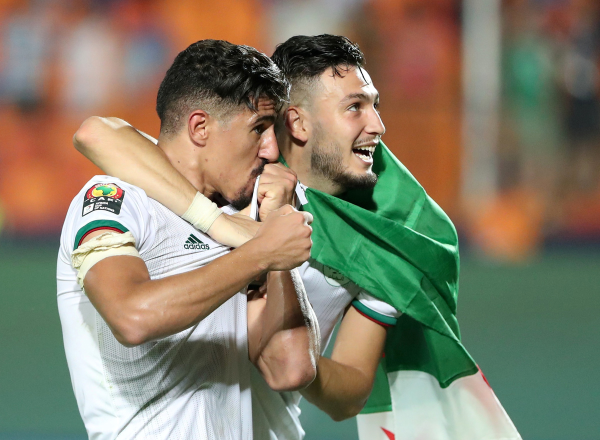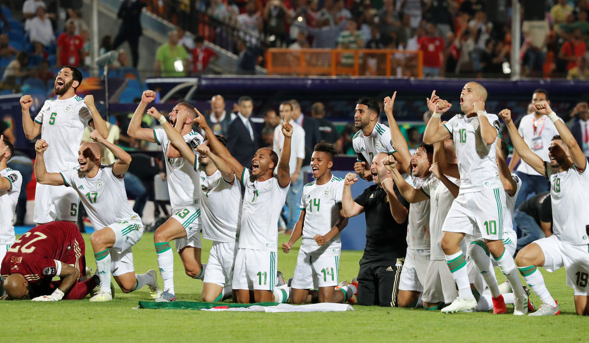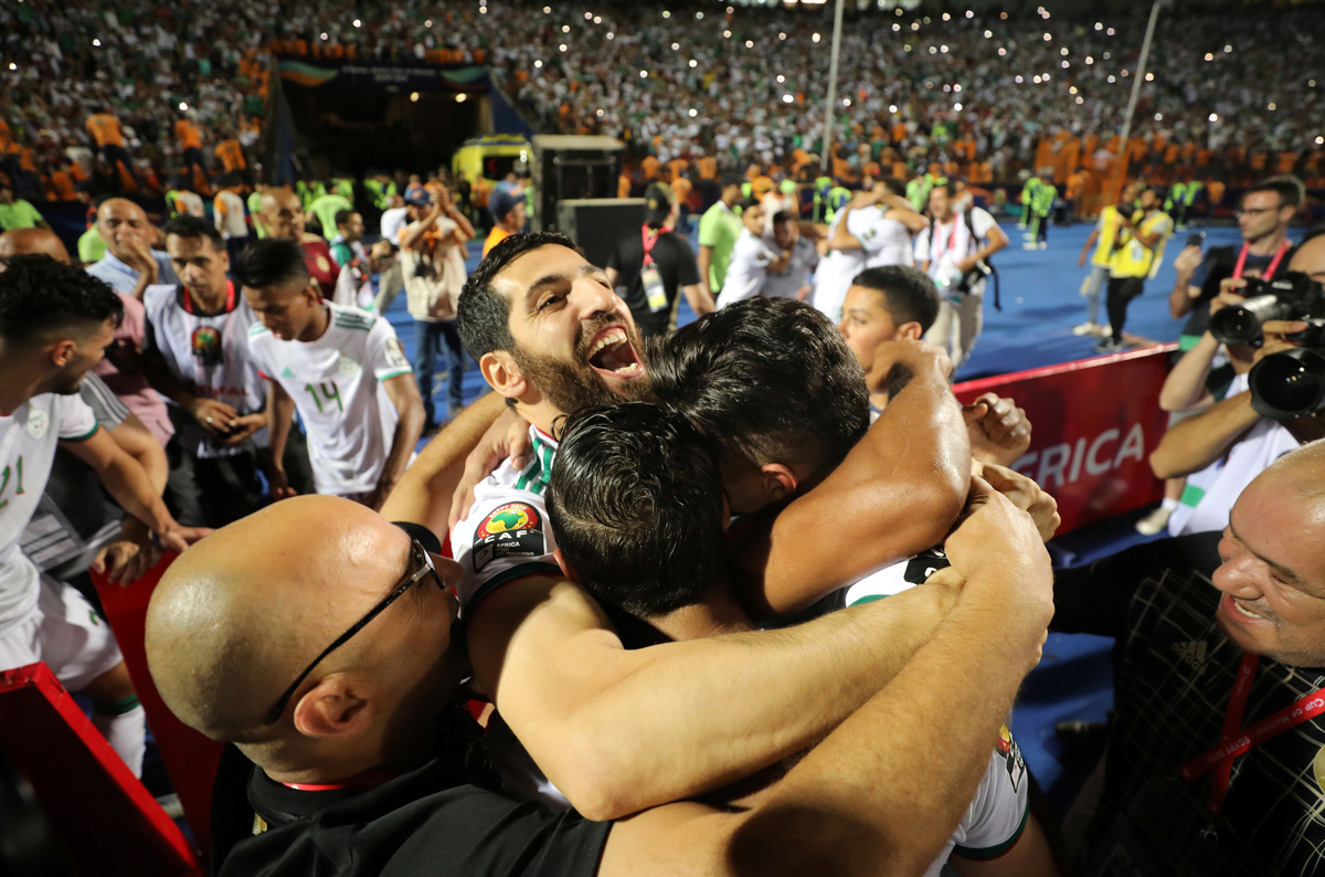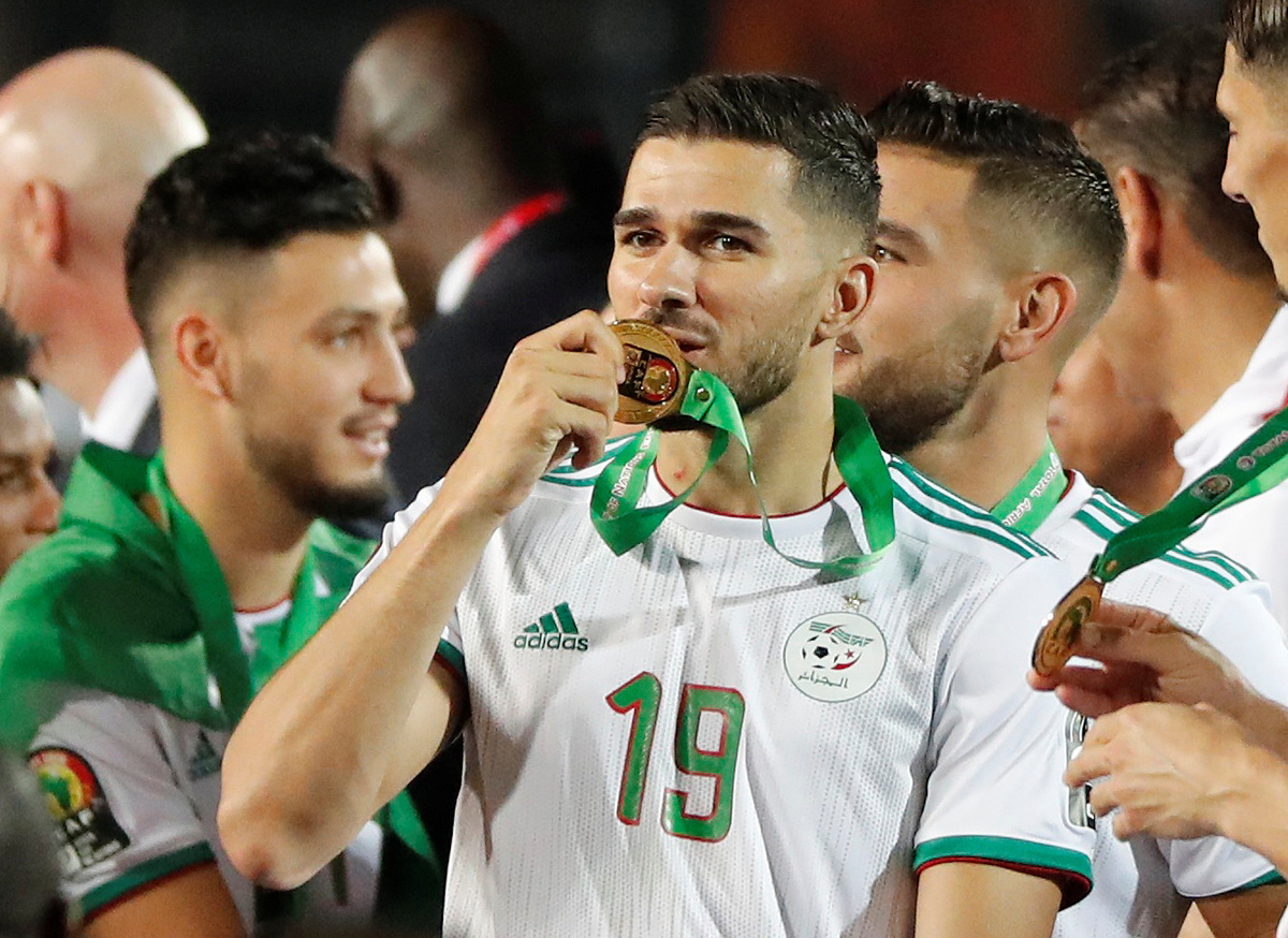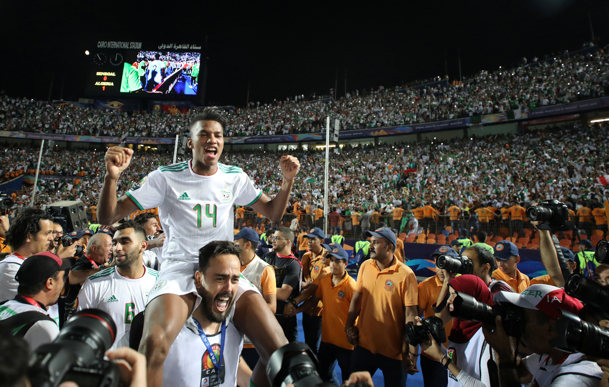 Soccer Football - Africa Cup of Nations 2019 - Final - Senegal v Algeria - Cairo International Stadium, Cairo, Egypt - July 19, 2019 Algeria celebrate winning the Africa Cup of Nations with the trophy REUTERS/Mohamed Abd El GhanySoccer Football - Africa Cup of Nations 2019 - Final - Senegal v Algeria - Cairo International Stadium, Cairo, Egypt - July 19, 2019 Algeria coach Djamel Belmadi and his team celebrate in front of their fans after winning the Africa Cup of Nations REUTERS/Mohamed Abd El GhanySoccer Football - Africa Cup of Nations 2019 - Final - Senegal v Algeria - Cairo International Stadium, Cairo, Egypt - July 19, 2019 Algeria's Yacine Brahimi and team mates celebrate in front of their fans after winning the Africa Cup of Nations REUTERS/Suhaib SalemSoccer Football - Africa Cup of Nations 2019 - Final - Senegal v Algeria - Cairo International Stadium, Cairo, Egypt - July 19, 2019 Algeria's Ramy Bensebaini and Baghdad Bounedjah celebrate winning the Africa Cup of Nations REUTERS/Suhaib SalemSoccer Football - Fans watch the Africa Cup of Nations 2019 - Final - Senegal v Algeria - Paris, France - July 19, 2019 Algeria fans celebrate in front of the Arc de Triomphe in Paris after the match REUTERS/Benoit TessierSoccer Football - Fans watch the Africa Cup of Nations 2019 - Final - Senegal v Algeria - Marseille, France - July 19, 2019 Algeria fans celebrate winning the Africa Cup of Nations REUTERS/Jean-Paul PelissierSoccer Football - Africa Cup of Nations 2019 - Final - Senegal v Algeria - Cairo International Stadium, Cairo, Egypt - July 19, 2019 Senegal's Ismaila Sarr is consoled by team mates and Algeria's Riyad Mahrez after the match REUTERS/Sumaya HishamSoccer Football - Africa Cup of Nations 2019 - Final - Senegal v Algeria - Cairo International Stadium, Cairo, Egypt - July 19, 2019 Algeria coach Djamel Belmadi is thrown in the air by the players as they celebrate winning the Africa Cup of Nations REUTERS/Suhaib SalemSoccer Football - Fans watch the Africa Cup of Nations 2019 - Final - Senegal v Algeria - Marseille, France - July 19, 2019 Algeria fans celebrate winning the Africa Cup of Nations REUTERS/Jean-Paul PelissierSoccer Football - Africa Cup of Nations 2019 - Final - Senegal v Algeria - Cairo International Stadium, Cairo, Egypt - July 19, 2019 Algeria's Adlene Guedioura and team mates celebrate winning the Africa Cup of Nations at the end of the match REUTERS/Suhaib SalemSoccer Football - Fans watch the Africa Cup of Nations 2019 - Final - Senegal v Algeria - Paris, France - July 19, 2019 Algeria fans celebrate in front of the Arc de Triomphe in Paris after the match REUTERS/Benoit TessierSoccer Football - Africa Cup of Nations 2019 - Final - Senegal v Algeria - Cairo International Stadium, Cairo, Egypt - July 19, 2019 Algeria's Hichem Boudaoui celebrates after winning the Africa Cup of Nations REUTERS/Mohamed Abd El GhanySoccer Football - Africa Cup of Nations 2019 - Final - Senegal v Algeria - Cairo International Stadium, Cairo, Egypt - July 19, 2019 Algeria celebrate after winning the Africa Cup of Nations REUTERS/Mohamed Abd El GhanySoccer Football - Fans watch the Africa Cup of Nations 2019 - Final - Senegal v Algeria - Paris, France - July 19, 2019 Algeria fans celebrate in front of the Arc de Triomphe in Paris after the match REUTERS/Benoit TessierSoccer Football - Fans watch the Africa Cup of Nations 2019 - Final - Senegal v Algeria - Marseille, France - July 19, 2019 Algeria fans celebrate winning the Africa Cup of Nations REUTERS/Jean-Paul PelissierSoccer Football - Fans watch the Africa Cup of Nations 2019 - Final - Senegal v Algeria - Marseille, France - July 19, 2019 Algeria fans celebrate winning the Africa Cup of Nations REUTERS/Jean-Paul PelissierSoccer Football - Africa Cup of Nations 2019 - Final - Senegal v Algeria - Cairo International Stadium, Cairo, Egypt - July 19, 2019 Algeria's Djamel Benlamri sustains an injury REUTERS/Sumaya HishamSoccer Football - Africa Cup of Nations 2019 - Final - Senegal v Algeria - Cairo International Stadium, Cairo, Egypt - July 19, 2019 Senegal's Keita Balde is fouled by Algeria's Mehdi Zeffane REUTERS/Amr Abdallah DalshSoccer Football - Africa Cup of Nations 2019 - Final - Senegal v Algeria - Cairo International Stadium, Cairo, Egypt - July 19, 2019 Senegal's Sadio Mane in action with Algeria's Mehdi Zeffane REUTERS/Suhaib SalemSoccer Football - Africa Cup of Nations 2019 - Final - Senegal v Algeria - Cairo International Stadium, Cairo, Egypt - July 19, 2019 Algeria's Djamel Benlamri reacts after sustaining a head injury as referee Neant Alioum looks on REUTERS/Amr Abdallah DalshSoccer Football - Africa Cup of Nations 2019 - Final - Senegal v Algeria - Cairo International Stadium, Cairo, Egypt - July 19, 2019 Algeria's Mehdi Zeffane in action with Senegal's Keita Balde REUTERS/Amr Abdallah DalshSoccer Football - Africa Cup of Nations 2019 - Final - Senegal v Algeria - Cairo International Stadium, Cairo, Egypt - July 19, 2019 Senegal's Keita Balde is fouled by Algeria's Mehdi Zeffane REUTERS/Amr Abdallah Dalsh