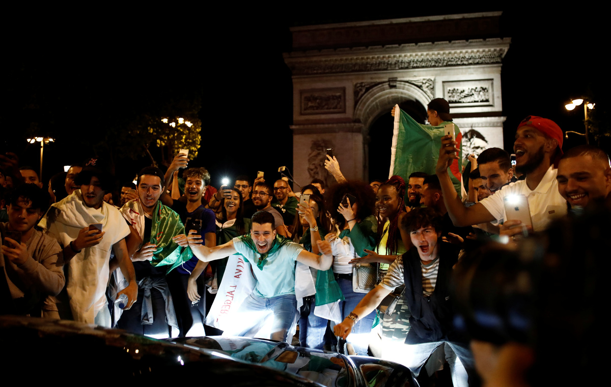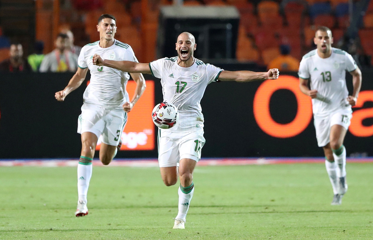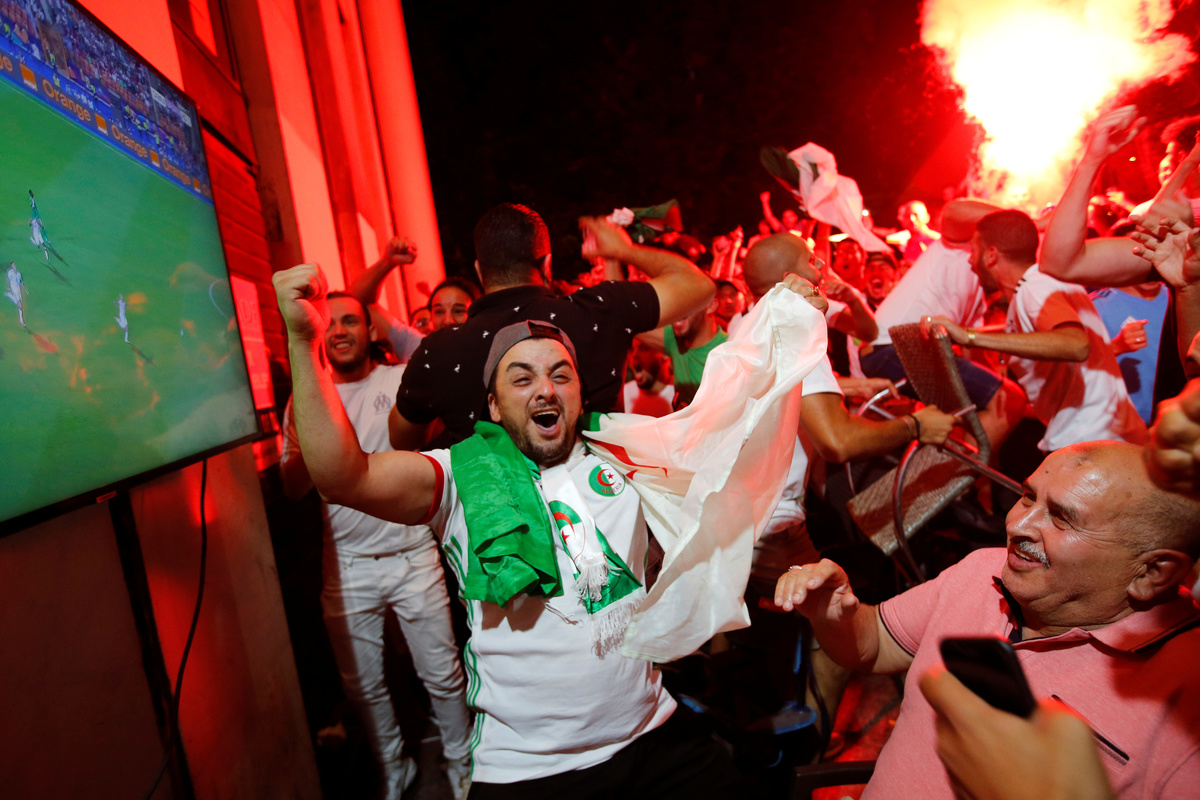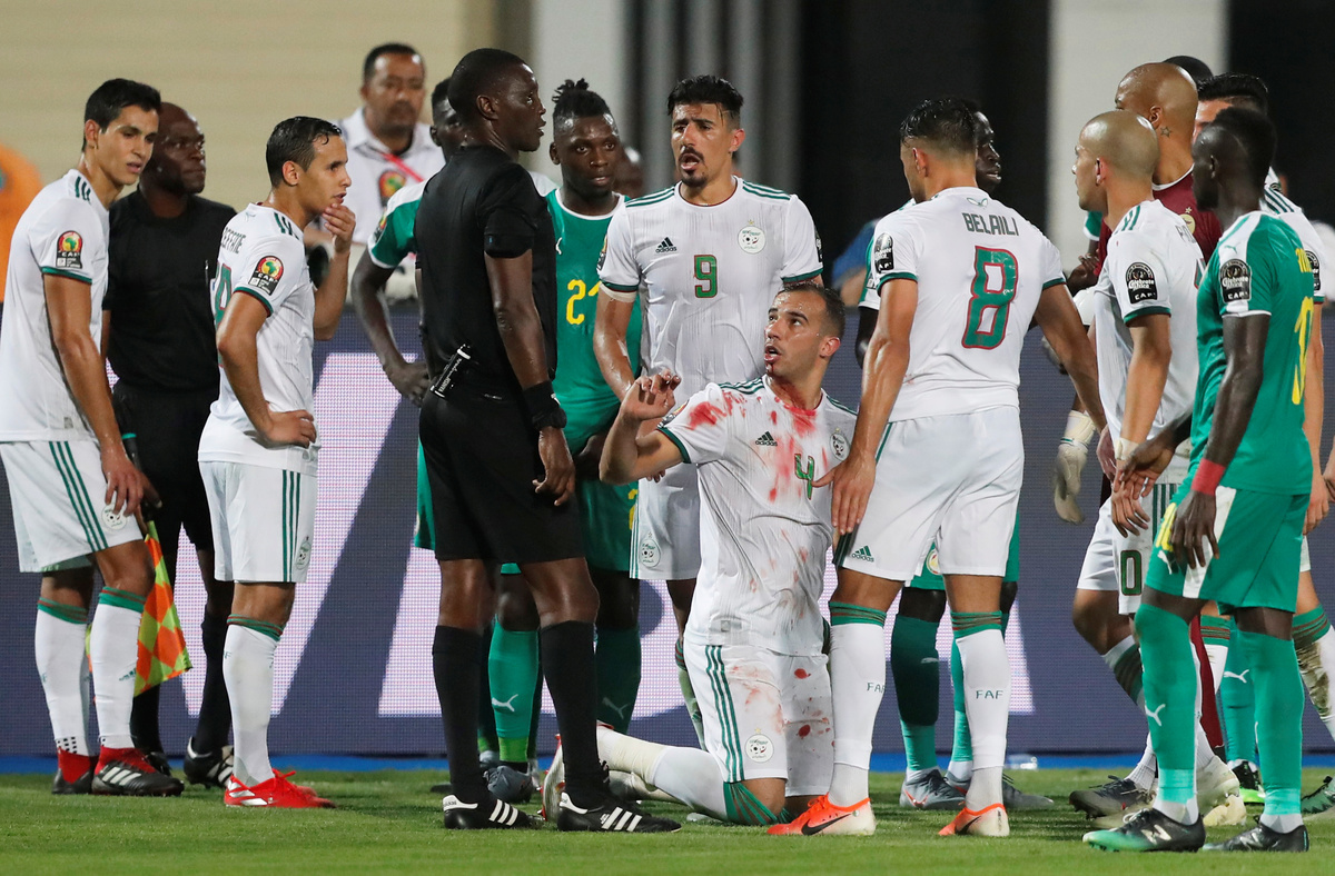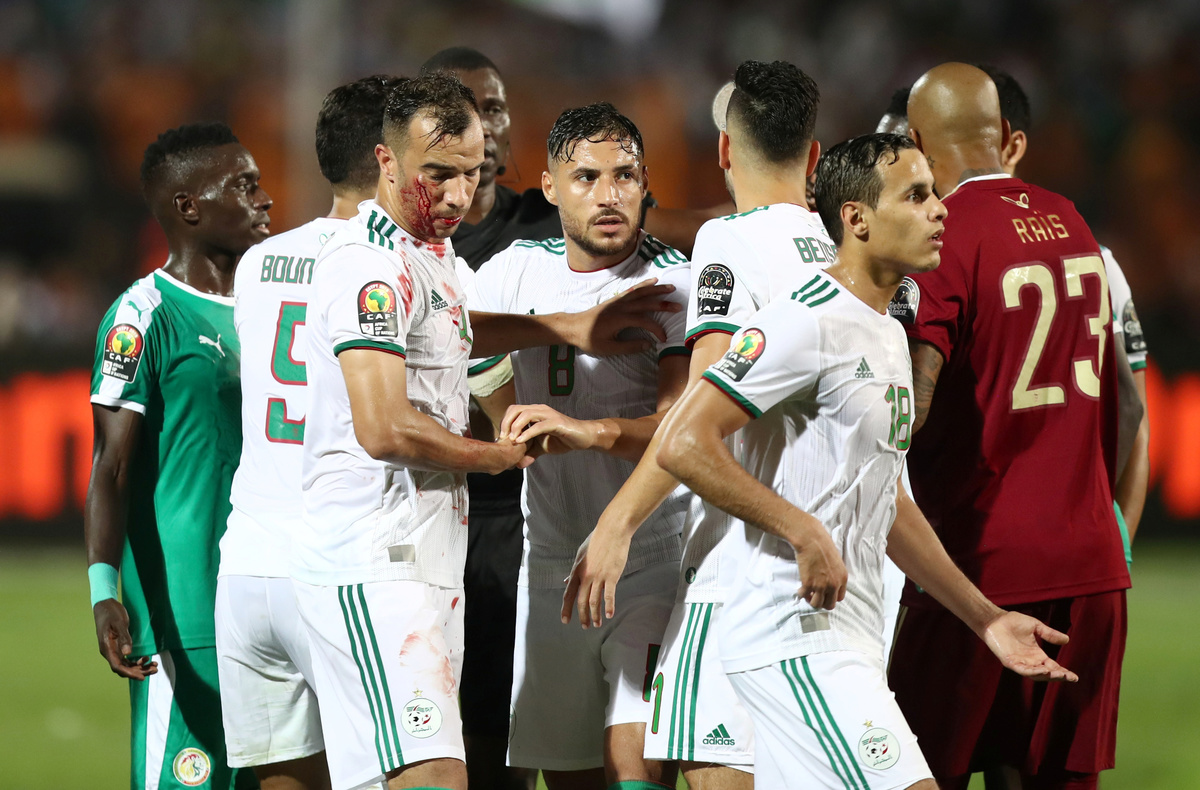 Soccer Football - Africa Cup of Nations 2019 - Final - Senegal v Algeria - Cairo International Stadium, Cairo, Egypt - July 19, 2019 Algeria celebrate winning the Africa Cup of Nations with the trophy REUTERS/Mohamed Abd El GhanySoccer Football - Africa Cup of Nations 2019 - Final - Senegal v Algeria - Cairo International Stadium, Cairo, Egypt - July 19, 2019 Algeria coach Djamel Belmadi and his team celebrate in front of their fans after winning the Africa Cup of Nations REUTERS/Mohamed Abd El GhanySoccer Football - Africa Cup of Nations 2019 - Final - Senegal v Algeria - Cairo International Stadium, Cairo, Egypt - July 19, 2019 Algeria's Yacine Brahimi and team mates celebrate in front of their fans after winning the Africa Cup of Nations REUTERS/Suhaib SalemSoccer Football - Africa Cup of Nations 2019 - Final - Senegal v Algeria - Cairo International Stadium, Cairo, Egypt - July 19, 2019 Algeria's Ramy Bensebaini and Baghdad Bounedjah celebrate winning the Africa Cup of Nations REUTERS/Suhaib SalemSoccer Football - Fans watch the Africa Cup of Nations 2019 - Final - Senegal v Algeria - Paris, France - July 19, 2019 Algeria fans celebrate in front of the Arc de Triomphe in Paris after the match REUTERS/Benoit TessierSoccer Football - Fans watch the Africa Cup of Nations 2019 - Final - Senegal v Algeria - Marseille, France - July 19, 2019 Algeria fans celebrate winning the Africa Cup of Nations REUTERS/Jean-Paul PelissierSoccer Football - Africa Cup of Nations 2019 - Final - Senegal v Algeria - Cairo International Stadium, Cairo, Egypt - July 19, 2019 Senegal's Ismaila Sarr is consoled by team mates and Algeria's Riyad Mahrez after the match REUTERS/Sumaya HishamSoccer Football - Africa Cup of Nations 2019 - Final - Senegal v Algeria - Cairo International Stadium, Cairo, Egypt - July 19, 2019 Algeria coach Djamel Belmadi is thrown in the air by the players as they celebrate winning the Africa Cup of Nations REUTERS/Suhaib SalemSoccer Football - Fans watch the Africa Cup of Nations 2019 - Final - Senegal v Algeria - Marseille, France - July 19, 2019 Algeria fans celebrate winning the Africa Cup of Nations REUTERS/Jean-Paul PelissierSoccer Football - Africa Cup of Nations 2019 - Final - Senegal v Algeria - Cairo International Stadium, Cairo, Egypt - July 19, 2019 Algeria's Adlene Guedioura and team mates celebrate winning the Africa Cup of Nations at the end of the match REUTERS/Suhaib SalemSoccer Football - Fans watch the Africa Cup of Nations 2019 - Final - Senegal v Algeria - Paris, France - July 19, 2019 Algeria fans celebrate in front of the Arc de Triomphe in Paris after the match REUTERS/Benoit TessierSoccer Football - Africa Cup of Nations 2019 - Final - Senegal v Algeria - Cairo International Stadium, Cairo, Egypt - July 19, 2019 Algeria's Hichem Boudaoui celebrates after winning the Africa Cup of Nations REUTERS/Mohamed Abd El GhanySoccer Football - Africa Cup of Nations 2019 - Final - Senegal v Algeria - Cairo International Stadium, Cairo, Egypt - July 19, 2019 Algeria celebrate after winning the Africa Cup of Nations REUTERS/Mohamed Abd El GhanySoccer Football - Fans watch the Africa Cup of Nations 2019 - Final - Senegal v Algeria - Paris, France - July 19, 2019 Algeria fans celebrate in front of the Arc de Triomphe in Paris after the match REUTERS/Benoit TessierSoccer Football - Fans watch the Africa Cup of Nations 2019 - Final - Senegal v Algeria - Marseille, France - July 19, 2019 Algeria fans celebrate winning the Africa Cup of Nations REUTERS/Jean-Paul PelissierSoccer Football - Fans watch the Africa Cup of Nations 2019 - Final - Senegal v Algeria - Marseille, France - July 19, 2019 Algeria fans celebrate winning the Africa Cup of Nations REUTERS/Jean-Paul PelissierSoccer Football - Africa Cup of Nations 2019 - Final - Senegal v Algeria - Cairo International Stadium, Cairo, Egypt - July 19, 2019 Algeria's Djamel Benlamri sustains an injury REUTERS/Sumaya HishamSoccer Football - Africa Cup of Nations 2019 - Final - Senegal v Algeria - Cairo International Stadium, Cairo, Egypt - July 19, 2019 Senegal's Keita Balde is fouled by Algeria's Mehdi Zeffane REUTERS/Amr Abdallah DalshSoccer Football - Africa Cup of Nations 2019 - Final - Senegal v Algeria - Cairo International Stadium, Cairo, Egypt - July 19, 2019 Senegal's Sadio Mane in action with Algeria's Mehdi Zeffane REUTERS/Suhaib SalemSoccer Football - Africa Cup of Nations 2019 - Final - Senegal v Algeria - Cairo International Stadium, Cairo, Egypt - July 19, 2019 Algeria's Djamel Benlamri reacts after sustaining a head injury as referee Neant Alioum looks on REUTERS/Amr Abdallah DalshSoccer Football - Africa Cup of Nations 2019 - Final - Senegal v Algeria - Cairo International Stadium, Cairo, Egypt - July 19, 2019 Algeria's Mehdi Zeffane in action with Senegal's Keita Balde REUTERS/Amr Abdallah DalshSoccer Football - Africa Cup of Nations 2019 - Final - Senegal v Algeria - Cairo International Stadium, Cairo, Egypt - July 19, 2019 Senegal's Keita Balde is fouled by Algeria's Mehdi Zeffane REUTERS/Amr Abdallah Dalsh