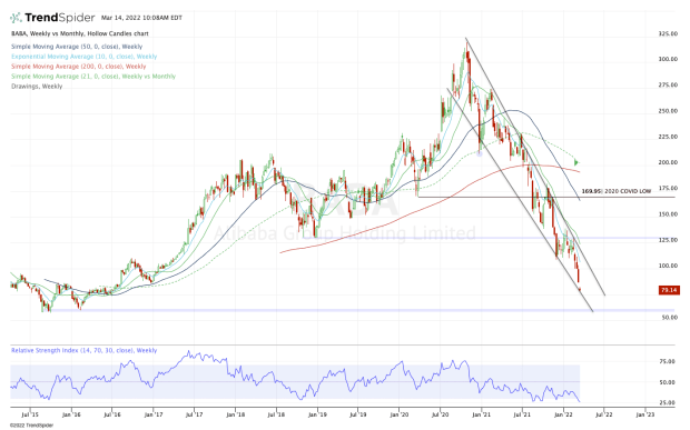 Alibaba stock sports a large, sharp and painful falling wedge pattern. At one point, it looked like it was bottoming and rotating back over $130 — that was a monthly up rotation at one point in January — but then it rolled over again and $130 became stout resistance.