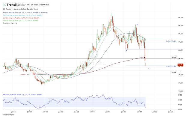 With this morning’s gap down, JD.com stock is trading right into the 161.8% downside extension. That has my attention.