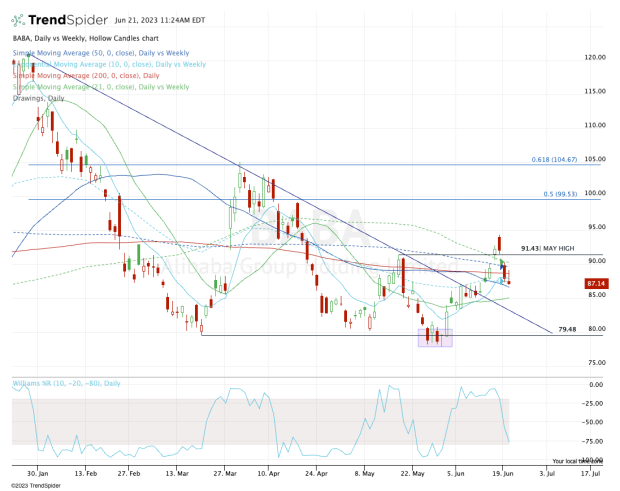 The rally also put the stock in a monthly-up rotation by clearing the May high near $91.50. Lastly, that rally put Alibaba above all its major daily moving averages and most of its key weekly moving averages.