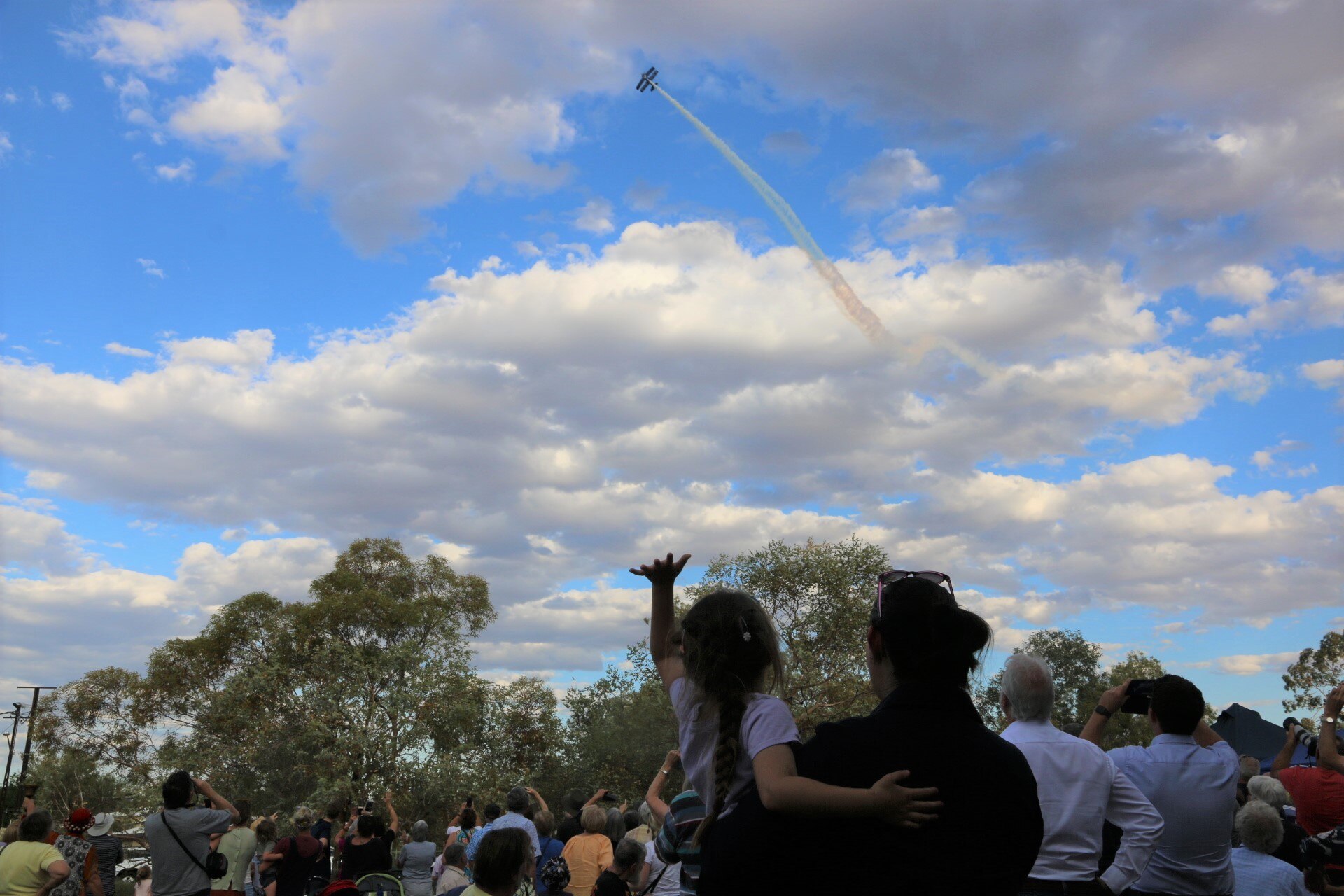 The crowd that attended centenary celebrations in Alice Springs was treated to a bi-plane flyover spectacle, followed by a re-enactment of Lietenant Briggs, Francis Birtles and George Bailey's arrival in the town.