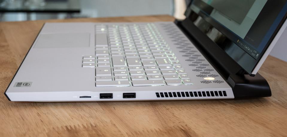 You can choose between two color schemes, Lunar White and Dark Side of the Moon; our test unit was the light Lunar White, which nicely complements the black bezel and rear exhaust port accents. The top of the deck, between the keyboard and display, features a pattern of honeycomb-shaped air intakes and an alien-head power button (which cleverly changes color to indicate whether you’re on AC or battery power and flashes maniacally when the battery is about to die).