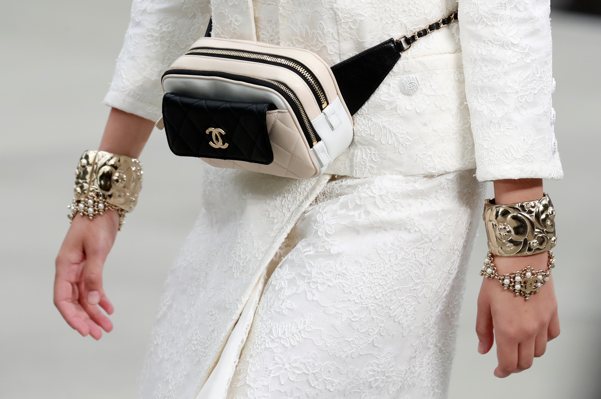 Accessories included ropes of pearls as necklaces, fanny packs and quilted-leather water bottles carried as a cross-body bag - accessories that have become de rigueur at fashion shows.