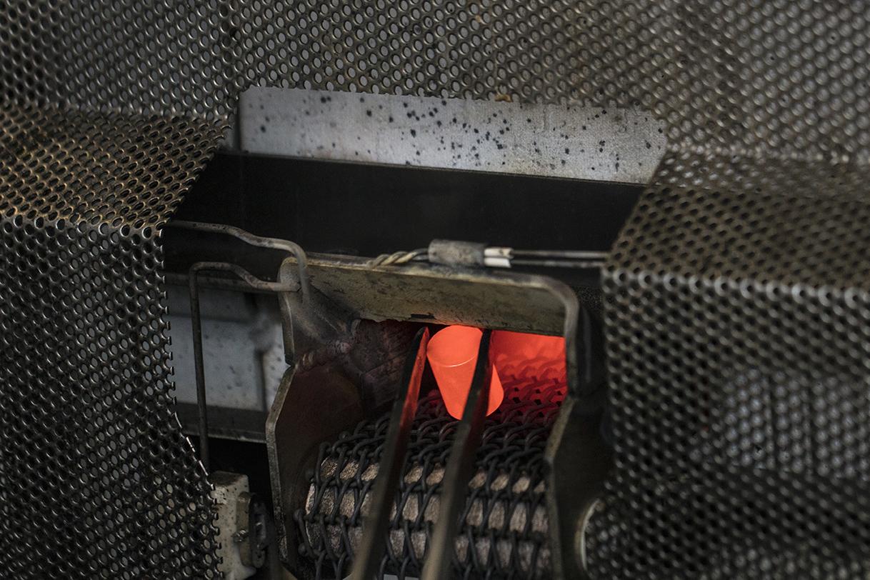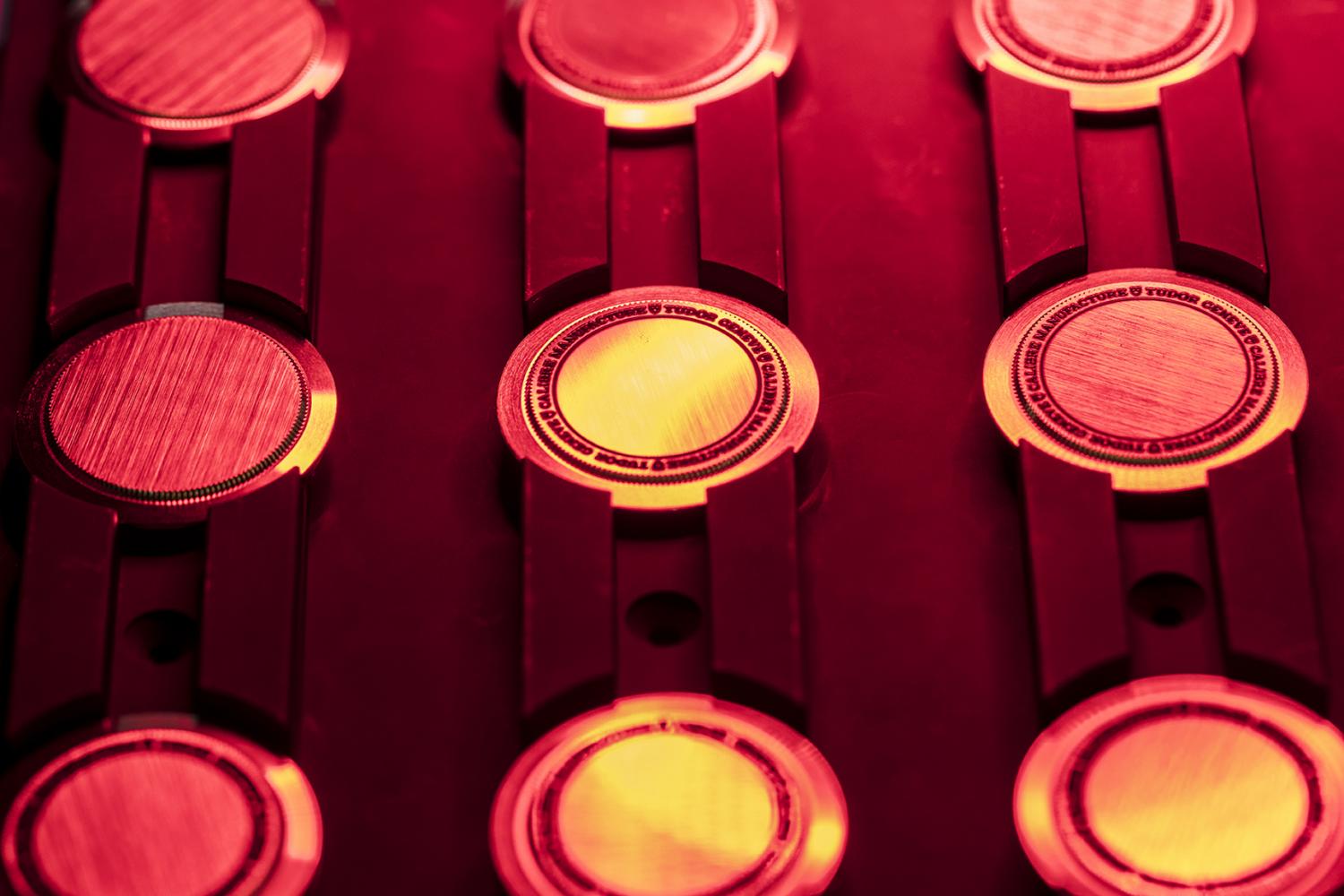 The bronze used by Tudor is made into bars, which in turn are cut into slugs that are small cylinders a few centimetres in length. The slugs are then heated to a high temperature before being stamped individually while hot using a friction screw press, applying a pressure of many tonnes.