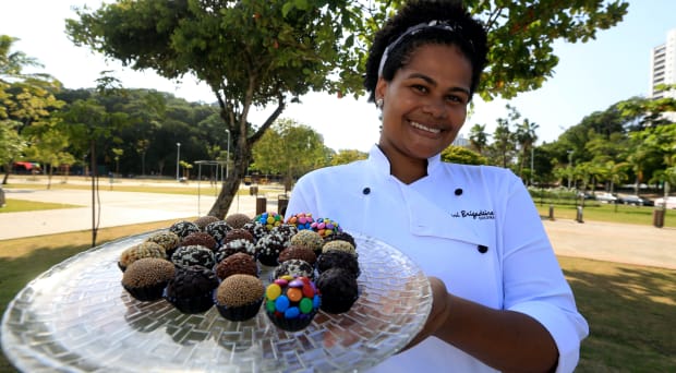 A vendor sells brigadeiros, a traditional Brazilian sweet, in Salvador, Bahia, Brazil.