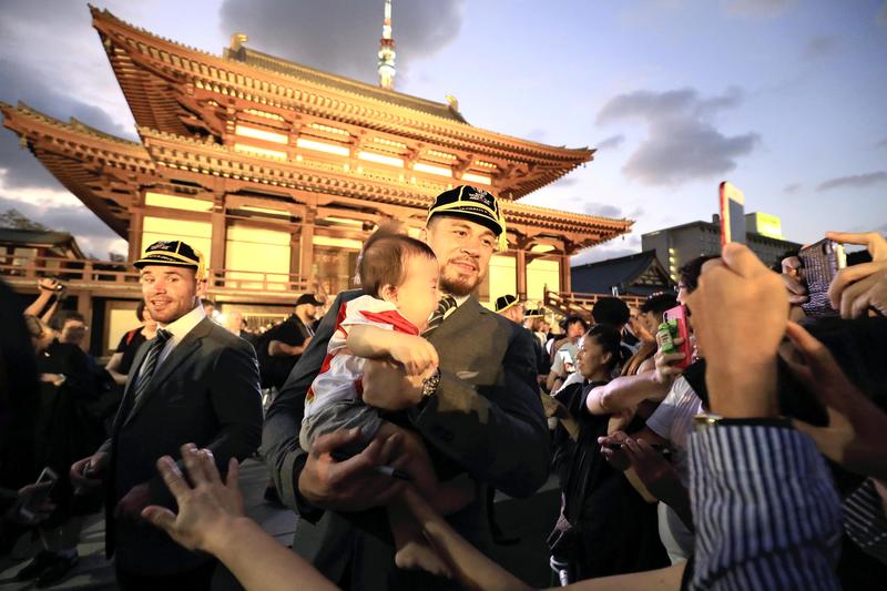 A Japanese-style ceremony to welcome New Zealand's All Blacks national rugby squad was held at Zojoji temple in Minato Ward, Tokyo, on Saturday. The three-time World Cup winners -- 1987, 2011 and 2015 -- aim to be the first team to claim a third consecutive World Cup title.