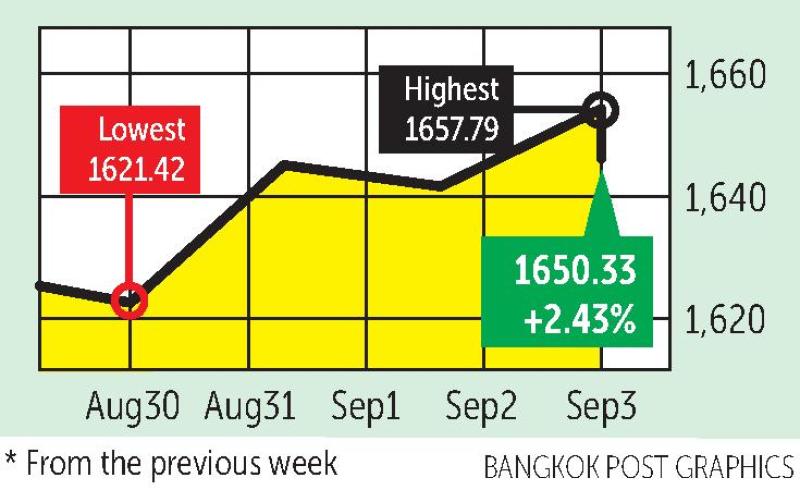 The SET index moved in a range of 1,621.42 and 1,657.79 points this week before closing yesterday at 1,650.33, up 2.4% from the previous week, in daily turnover averaging 106.62 billion baht.