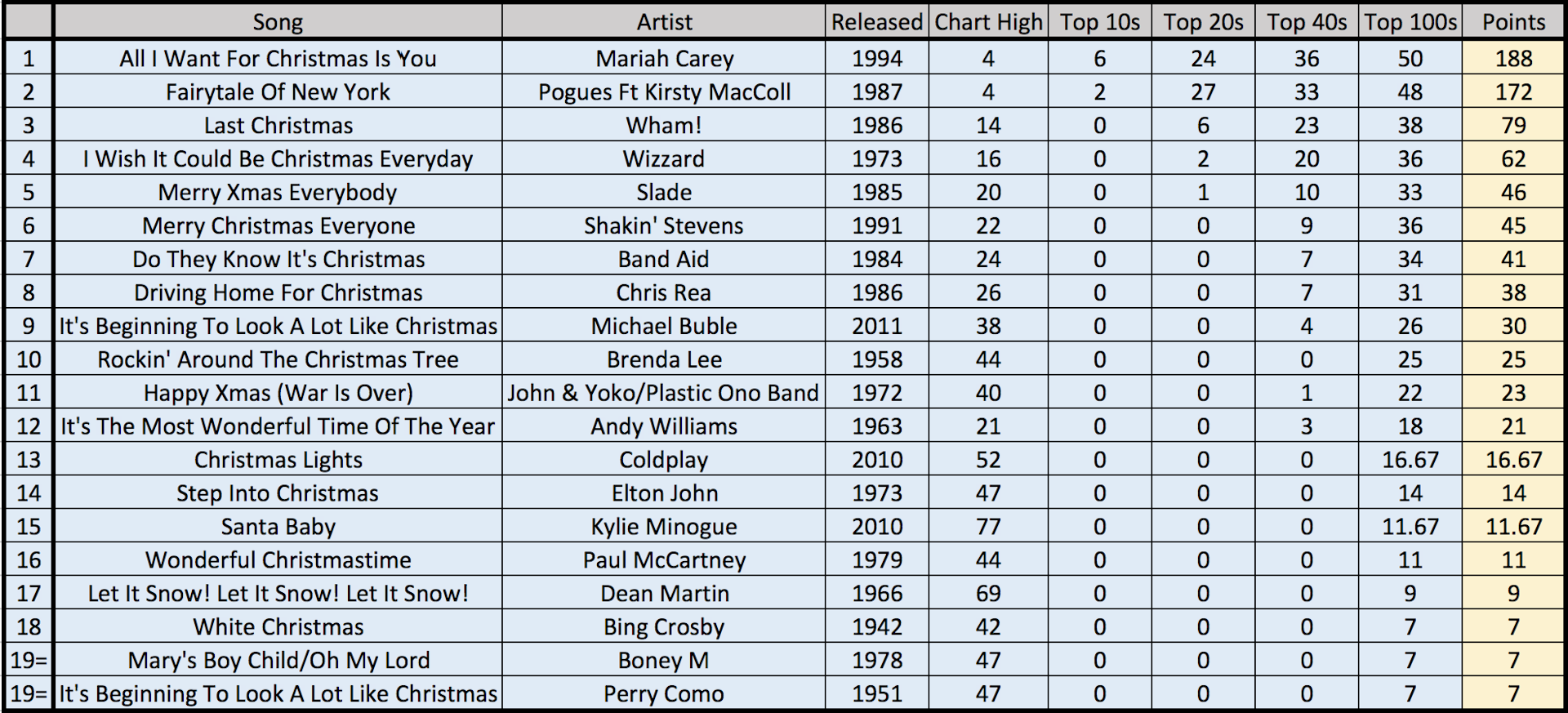 Based on our points system, we can see that Mariah Carey’s All I Want For Christmas is You is the UK’s favourite Christmas song, narrowly pipping Fairytale of New York by The Pogues and Kirsty MacColl. Both of these songs are way out in front of everything else; they both made it as high as Number 4 in the charts, while none of the rest cracked the Top 10. Amazingly, Carey’s track appeared in the UK Top 100 in every single week that we studied, while The Pogues were in there in all but two weeks. Ultimately, Carey came top on account of spending more weeks in the Top 10 than the Pogues did.