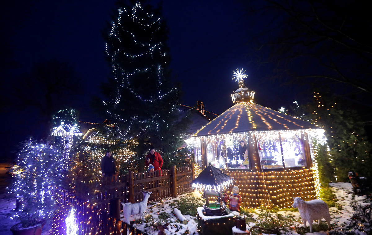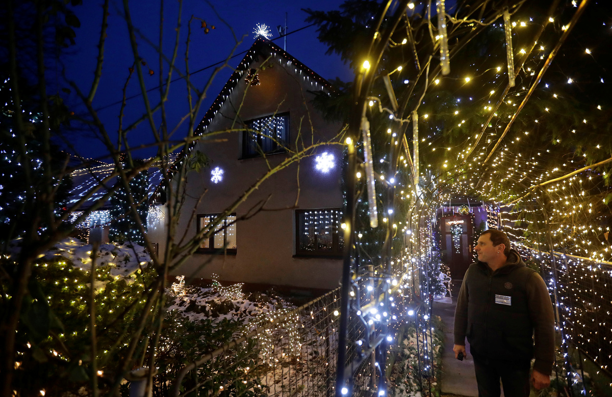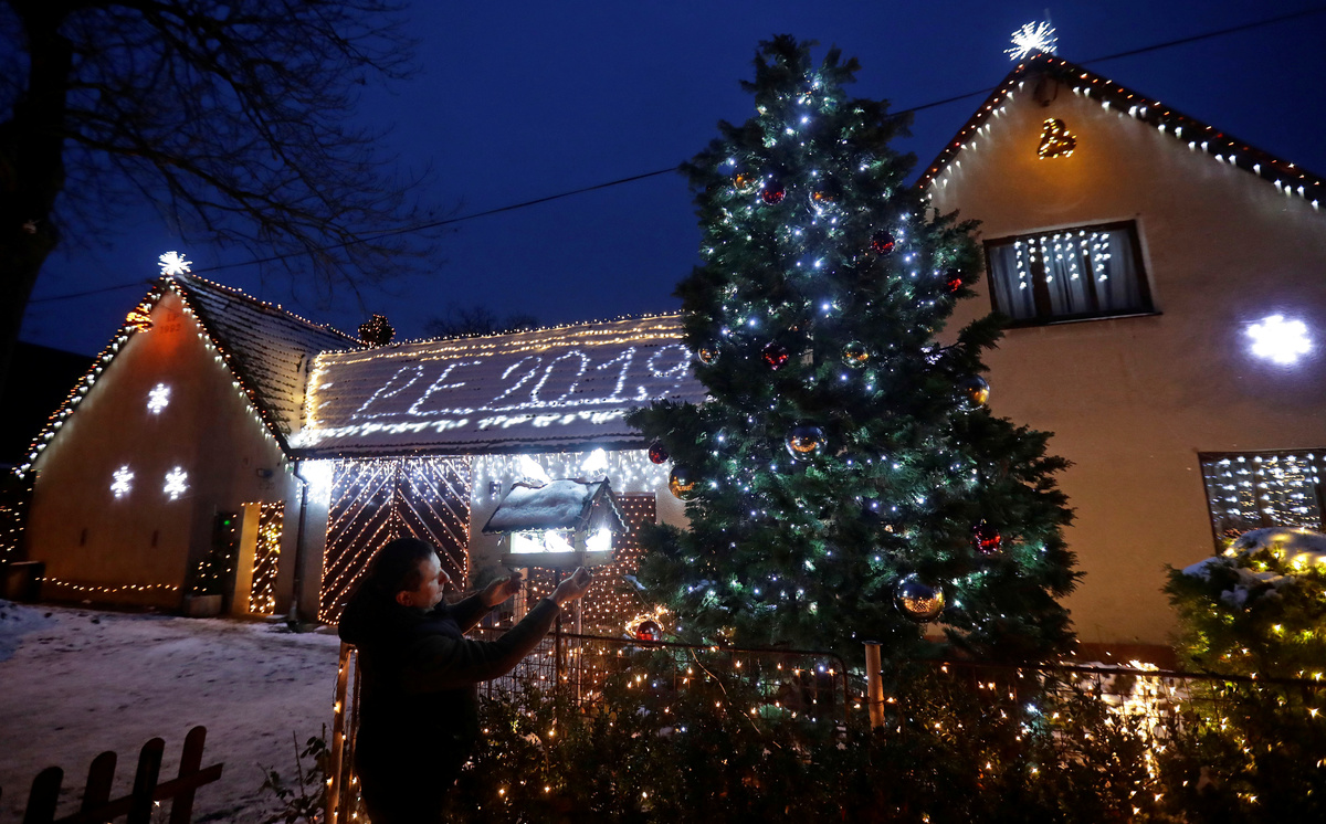 Vaclav Trunec, 46, adjusts the Christmas lighting decoration outside his house in the village of Chotovice near the town of Litomysl, Czech Republic, December 18, 2018. REUTERS/David W Cerny