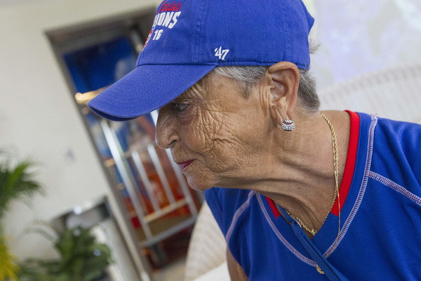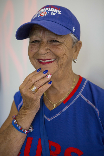 Carrino is sitting in the lobby of a Collins Avenue beachfront condominium wearing a blue Cubs blouse and cap. Her fingernails are polished in Cubs colors. Her lips are painted Cubs red. Her toenails match her fingernails, and her skin is bronzed from hours sitting in the outfield bleachers.