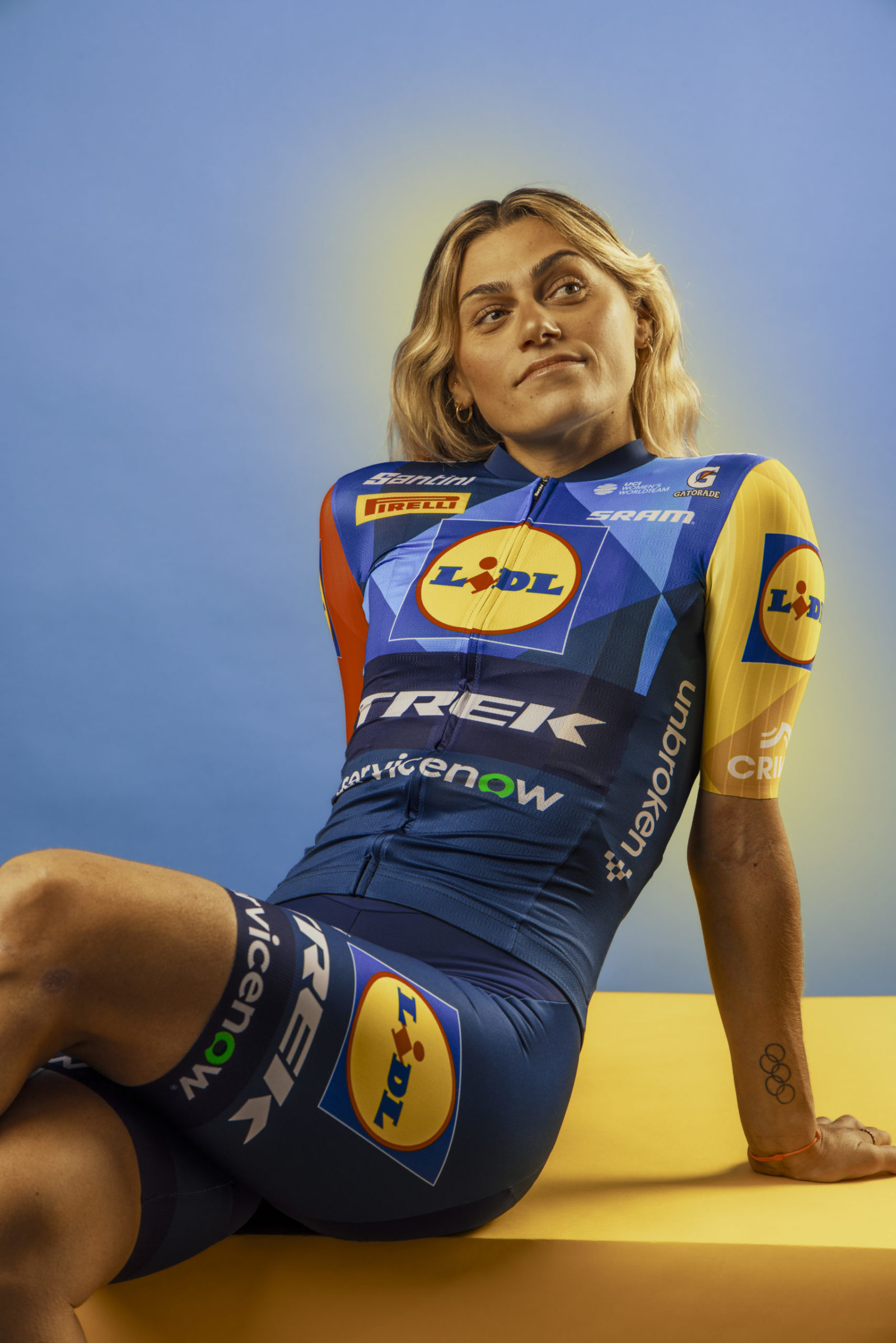 Lidl-Trek's kit is different. Definitely. There's less red on the front, more blue, and there's a new sponsor on the front, but it is, essentially, the same as last year. There's nothing wrong with that! It's a good kit! "Our favourite colours" is what the team said. Keep it simple. The men and women use the same kit, which is good.