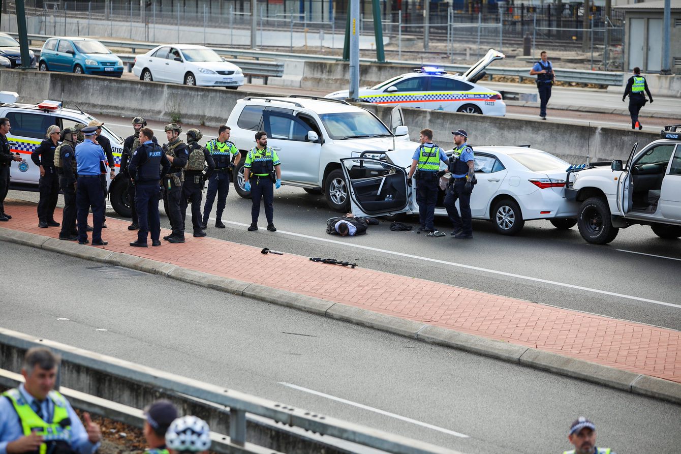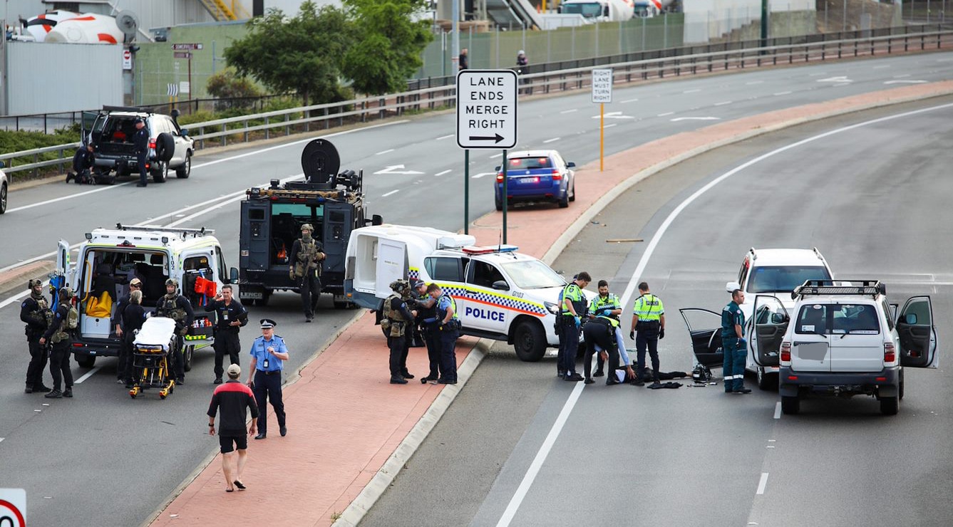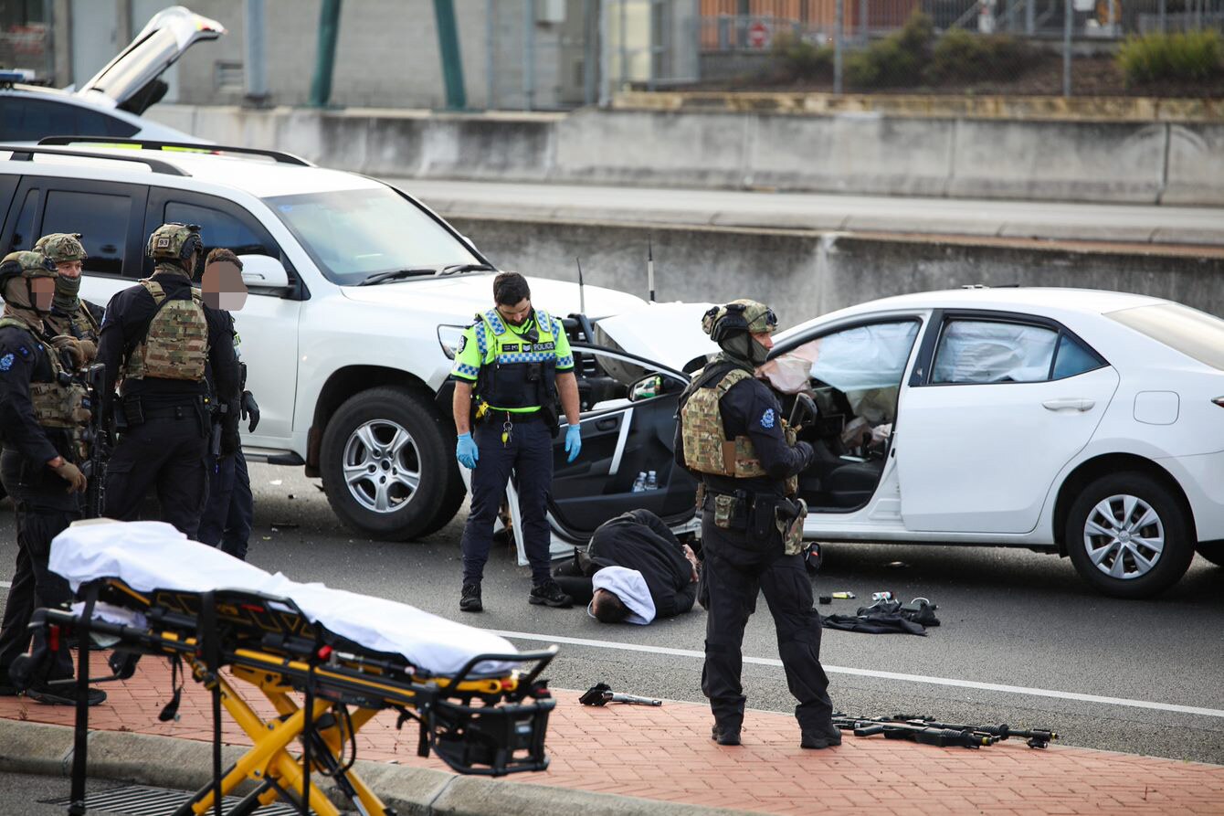 Multiple shots were fired during the incident, with officers from the WA Police Tactical Response Group (TRG) using two four-wheel drives to pin a sedan carrying the suspect and arrest him.