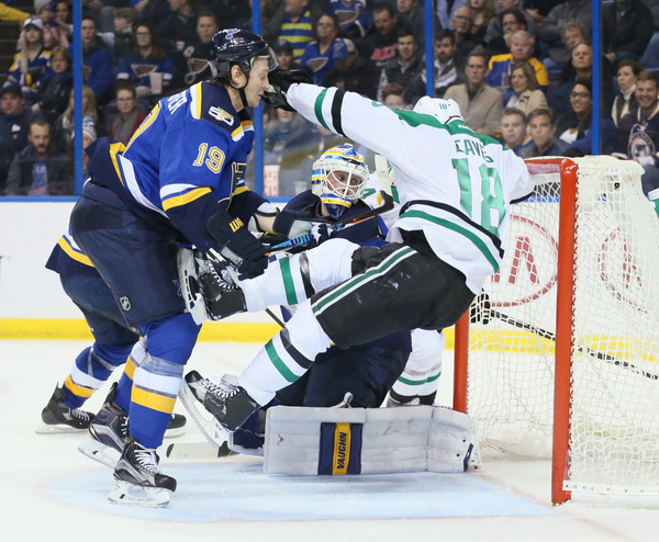 It was a strange night for the Blues after backup goalie Carter Hutton took a puck to the foot in the morning skate and couldn't play. The Blues had to summon Ville Husso in from San Antonio, but since his flight wouldn't get in until after the game started, they called in 25-year-old Tyler Stewart, a former St. Louis University club goalie who is now going to grad school at Maryville and plays in the adult league at Brentwood. Stewart skated with the team in pregame warmups and watched the first period from the Blues dressing room until Husso showed up late in the period.
