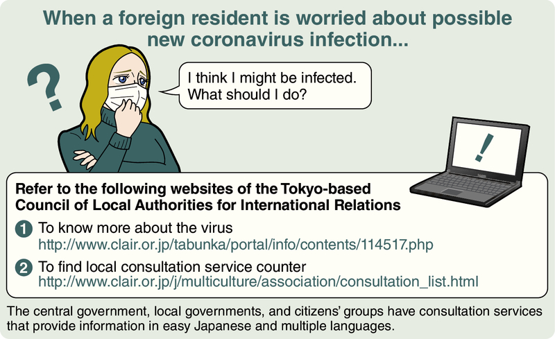 A: Actually, information about the coronavirus specifically for foreigners not familiar with Japanese is available from the central government, prefectures, and civic groups that promote international exchanges. The website of the Council of Local Authorities for International Relations (CLAIR) is well organized and easy to read.