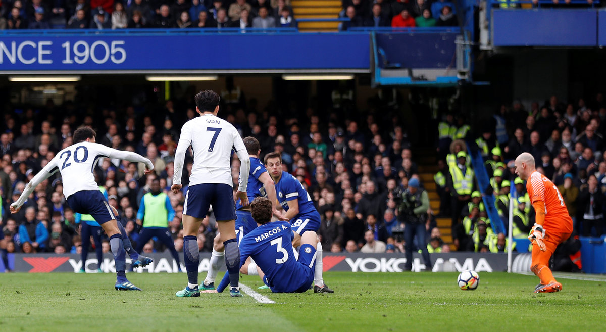 Son caused more panic in the Chelsea defence and after the South Korean had two efforts blocked, the ball fell to Alli who took a touch before firing home.
