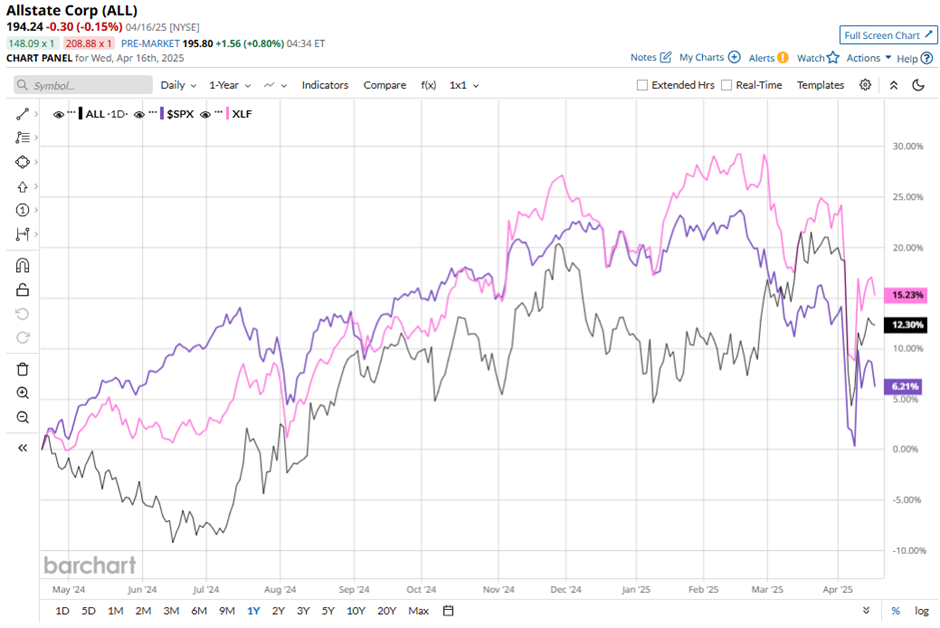 ALL stock has gained nearly 18.3% over the past 52 weeks, outperforming the S&P 500 Index’s ($SPX) 4.4% rise and the Financial Select Sector SPDR Fund’s (XLF) 17.5% return during the same time frame.
