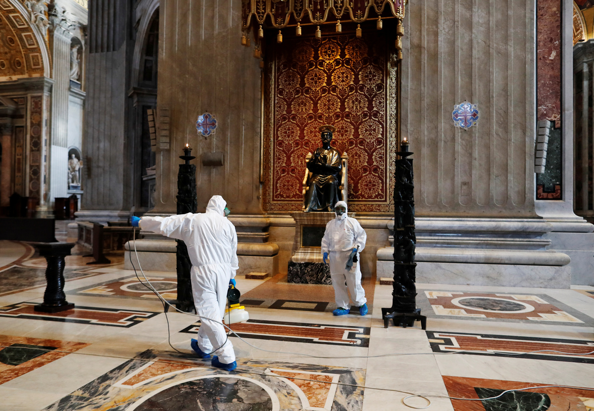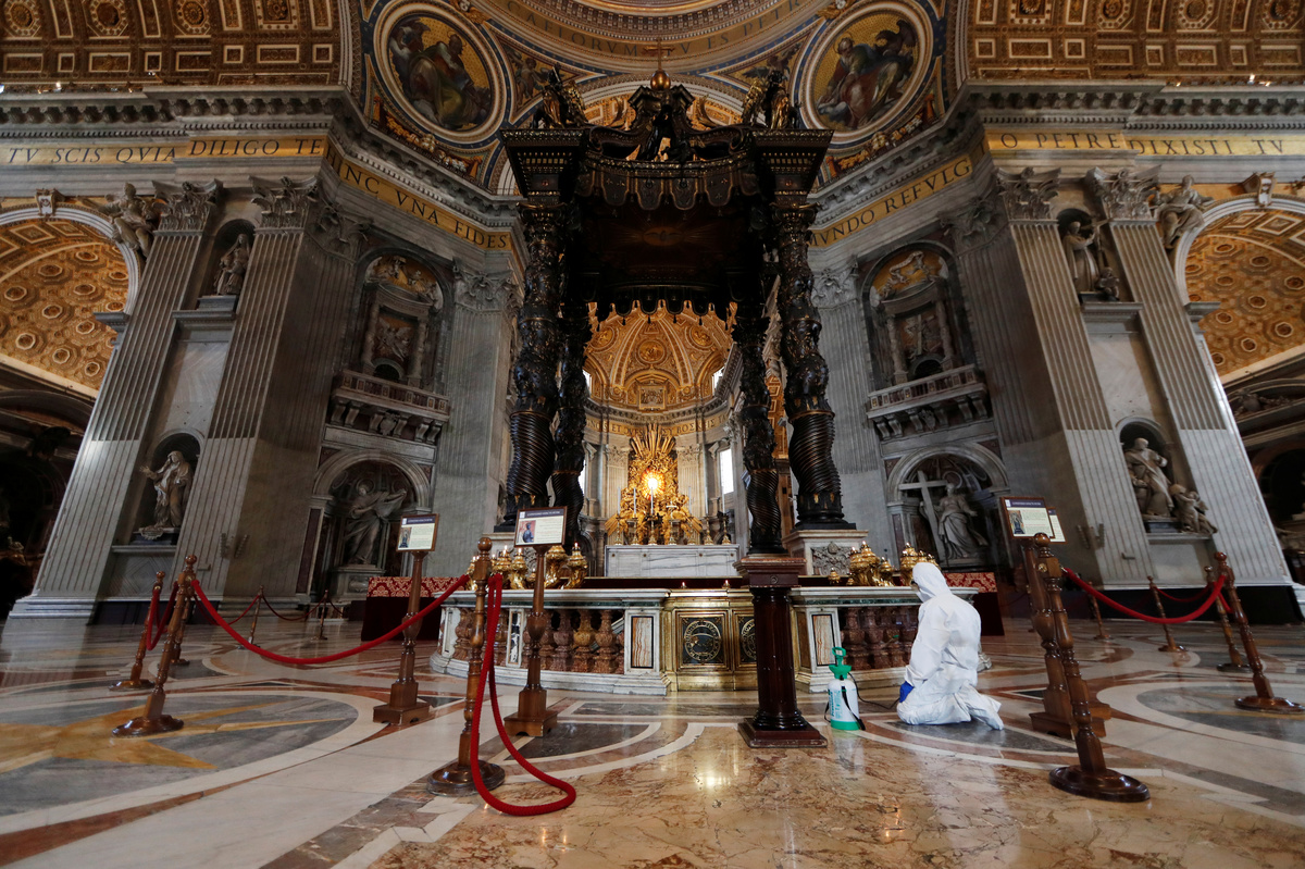 Swiss guard members wear protective face masks, during the spread of the coronavirus disease (COVID-19), at the Vatican, May 15, 2020. REUTERS/Yara NardiVatican staff members in protective gear sanitise the interior of St. Peter's Basilica, as part of efforts to combat a spread of the coronavirus disease (COVID-19), at the Vatican, May 15, 2020. REUTERS/Yara NardiVatican staff members in protective gear sanitise the interior of St. Peter's Basilica, as part of efforts to combat a spread of the coronavirus disease (COVID-19), at the Vatican, May 15, 2020. REUTERS/Yara NardiVatican staff members in protective gear sanitise the interior of St. Peter's Basilica, as part of efforts to combat a spread of the coronavirus disease (COVID-19), at the Vatican, May 15, 2020. REUTERS/Yara NardiA Vatican staff member in protective gear sanitises the interior of St. Peter's Basilica, as part of efforts to combat a spread of the coronavirus disease (COVID-19), at the Vatican, May 15, 2020. REUTERS/Yara NardiVatican staff members in protective gear sanitise the interior of St. Peter's Basilica, as part of efforts to combat a spread of the coronavirus disease (COVID-19), at the Vatican, May 15, 2020. REUTERS/Yara NardiA Vatican staff member in protective gear sanitises the interior of St. Peter's Basilica, as part of efforts to combat a spread of the coronavirus disease (COVID-19), at the Vatican, May 15, 2020. REUTERS/Yara Nardi