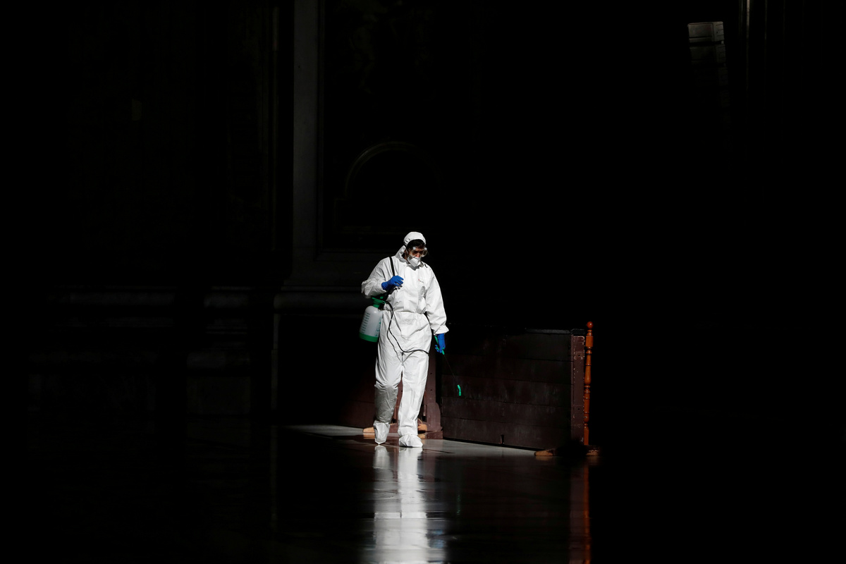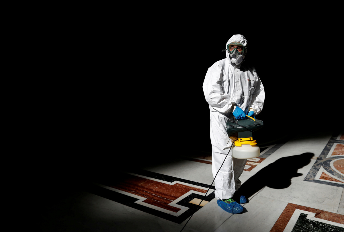A Vatican staff member in protective gear sanitises the interior of St. Peter's Basilica, as part of efforts to combat a spread of the coronavirus disease (COVID-19), at the Vatican, May 15, 2020. REUTERS/Yara Nardi