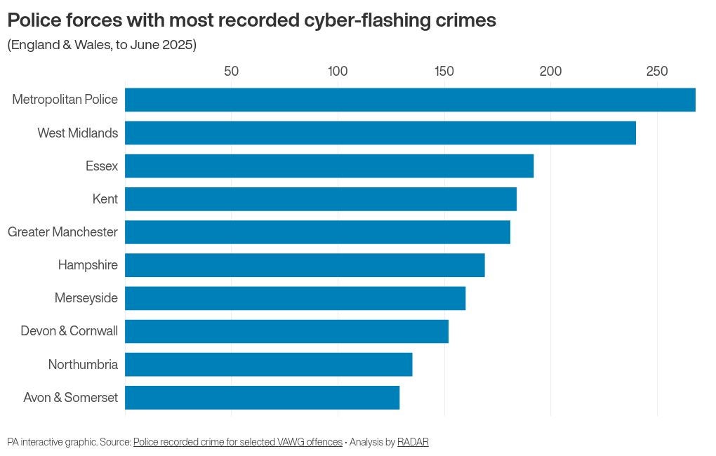 The Met Police recorded the highest number of cyber-flashing crimes (268), followed by West Midlands Police (240) and Essex Police (192).