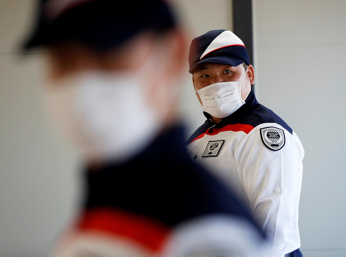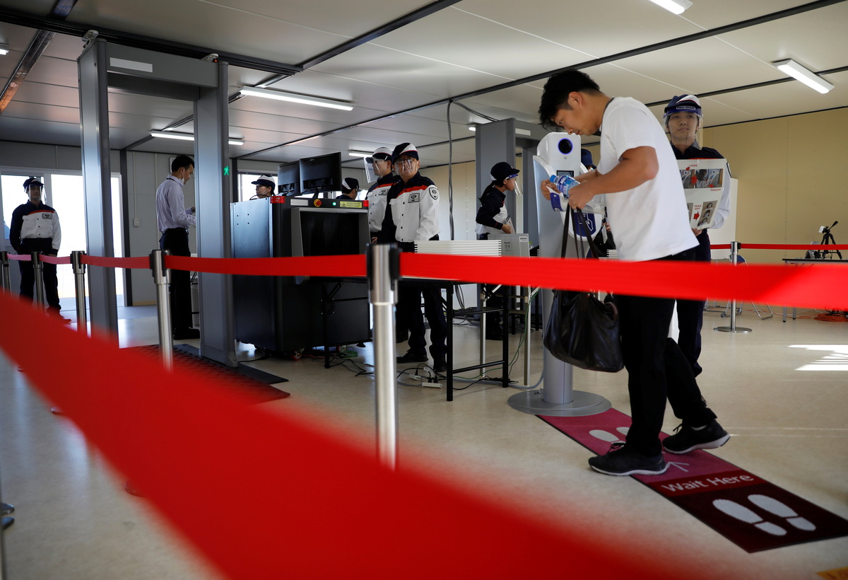 Security officers conduct a test session of screening measures for games officials including COVID-19 countermeasures, hosted by Tokyo Organising Committee of the Olympic and Paralympic Games, ahead of the summer games that have been postponed to 2021 due to the disease outbreak, at Tokyo Big Sight, Japan October 21, 2020. REUTERS/Issei Kato